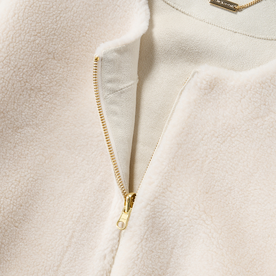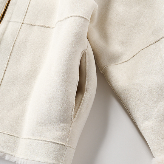 毛足の異なるボアを袖とウエスト辺りで切り替えた、表情感のある見た目になっており、スエード面を表にすると、