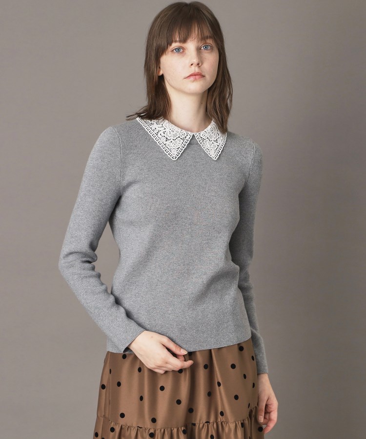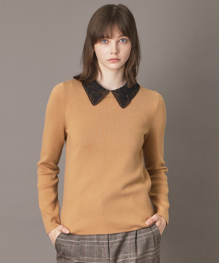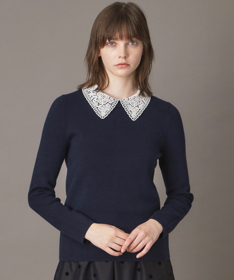 【取り外し可能なレース衿で着回し力◎のコンパクトニット】●オリジナルのレース衿とパール調釦が華やかなデザイン●パターンメイキングから作られた立体的なシルエット●毛羽の少ない表面感で秋から春にかけて長期間着用可能●こだわりオリジナルで仕上げた繊細なレース衿がポイントのレディなデザイン。シンプルなクルーネックとしても着られる2WAY仕様で、衿元の収まりと付け外しのイージーさを両立した仕様にしています。着脱のためのパール調釦は、衿を外した際も後ろ姿を華やかに見せてくれます。ニットアイテムとしては珍しいパターンメイキングから作られたアイテムで、レース衿は首元にコンパクトに収まるようバランス良く仕上げられています。立体的なシルエットで身体のラインを美しく、腕の可動域を計算した設計でコンパクトなサイズ感ながらも動きやすい作りになっています。●素材光沢のある原毛を使用した防縮ウールとコットンの混紡糸をスムース編することで適度な肉感を出し、滑らかなタッチに仕上げています。ソフトな綿の風合いとウールの温かさを併せ持っており、毛羽の少ないクリアーな表面感で秋から春にかけて長い期間着用いただけます。コンパクトなサイズ感でありながら、身体のラインを拾いすぎない程よい肉感の編地で仕上げており、ジャケットやキャミワンピースのインナーとしてもスッキリと着用いただけます。※製品寸法は平置きのスペックとなっております。こちらの商品は伸縮性があります。 ※照明の関係により、実際よりも色味が違って見える場合があります。また、パソコン・スマートフォンなどの環境により、若干製品と画像のカラーが異なる場合もございます。