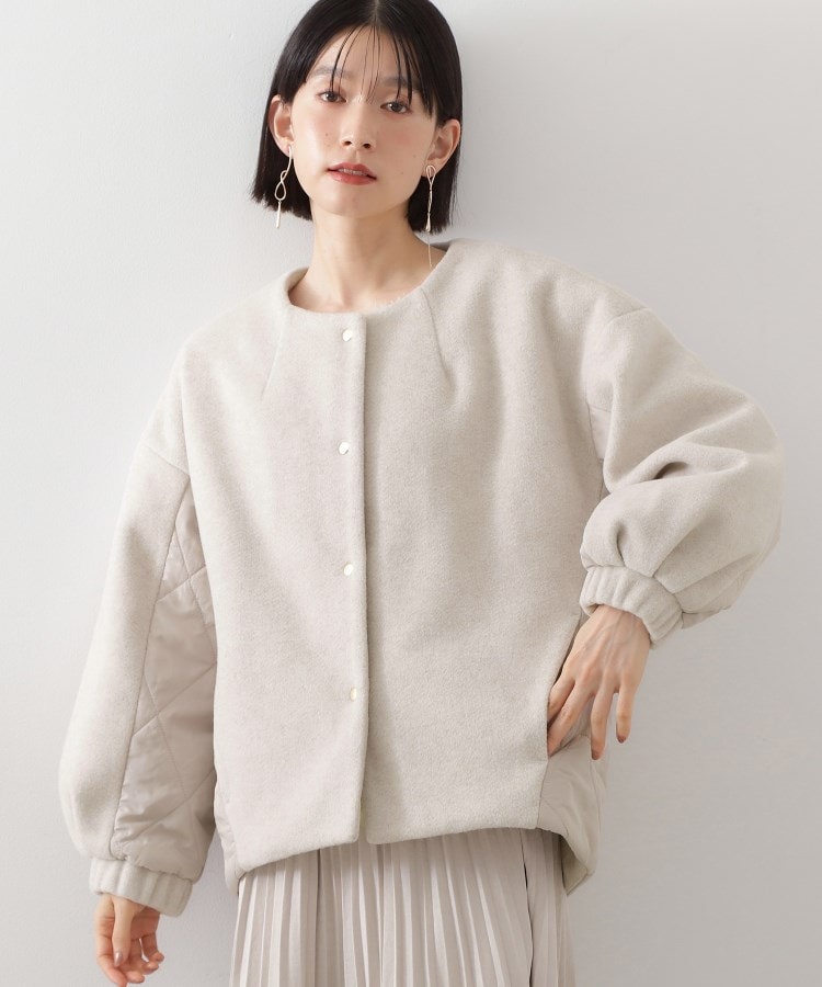 【デザイン&コンセプト】フロントはフェイクウール、後ろはタフタ生地のキルトパネルで切り替えたノーカラーのブルゾンです。上品なシルエットが特徴で、コートとブルゾンの中間の羽織りアイテムとして、洗練された大人のスタイルを演出。【素材&仕上げ】フェイクウールとタフタのキルト生地の組み合わせが、クラシカルな魅力を引き出します。丁寧な縫製とキルト加工により、立体感と保温性を両立しており、良質な風合いが感じられる一着です。【着こなしポイント】シンプルなデザインなので、インナーにシャツやニット、またはジャケットとのレイヤードスタイルとしても活躍。コートとブルゾンの中間羽織りとして、オフィスカジュアルや普段使いに幅広くご利用いただけます。【仕様】・ポケット数:横×2・裏地あり※照明の関係により、実際よりも色味が違って見える場合があります。また、パソコン・スマートフォンなどの環境により、若干製品と画像のカラーが異なる場合もございます。