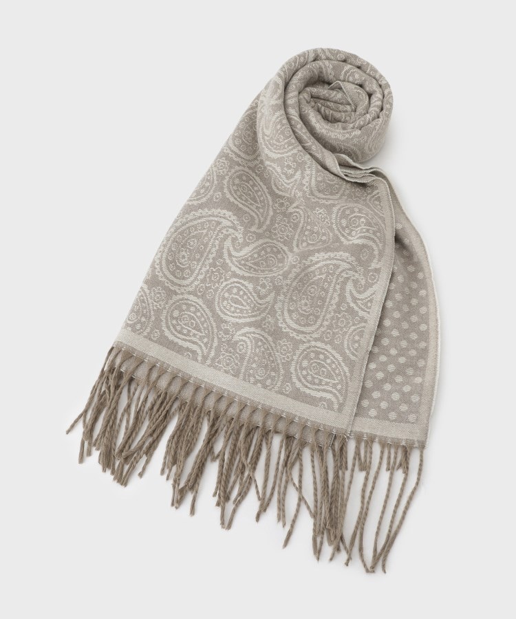 【デザイン】高見えする、ジャガード織りのストールです。ペイズリー柄とドット柄のリバーシブル仕様になっています。大判のストールなので首を暖かくカバーし、いろんなアレンジがしやすいのも魅力です。ご自身用にはもちろんの事、プレゼントとしてもおすすめです。※照明の関係により、実際よりも色味が違って見える場合があります。また、パソコン・スマートフォンなどの環境により、若干製品と画像のカラーが異なる場合もございます。
