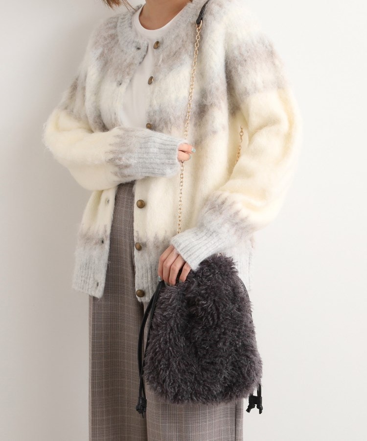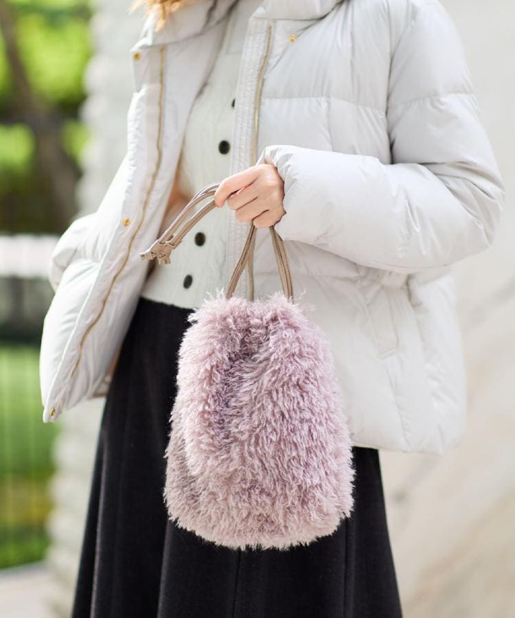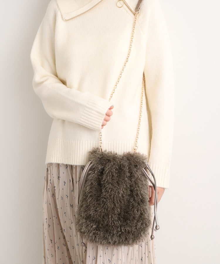 【デザイン】柔らかく毛足の長いふわふわのプードルフェイクファーの巾着ショルダー。ショルダーはチェーン使いでフェミニンに、肩部分は合皮で肩に食い込みにくくしています。ショルダーは取り外し可能。ショルダーを外し、巾着紐で持てる2WAY。口元はマグネット付きで中が見えないので安心です。【仕様】・ポケット数:内側×1※照明の関係により、実際よりも色味が違って見える場合があります。また、パソコン・スマートフォンなどの環境により、若干製品と画像のカラーが異なる場合もございます。【25AW】