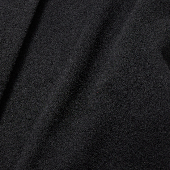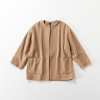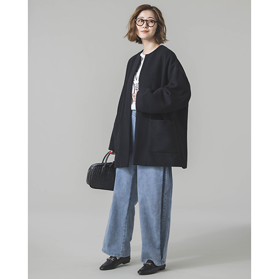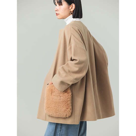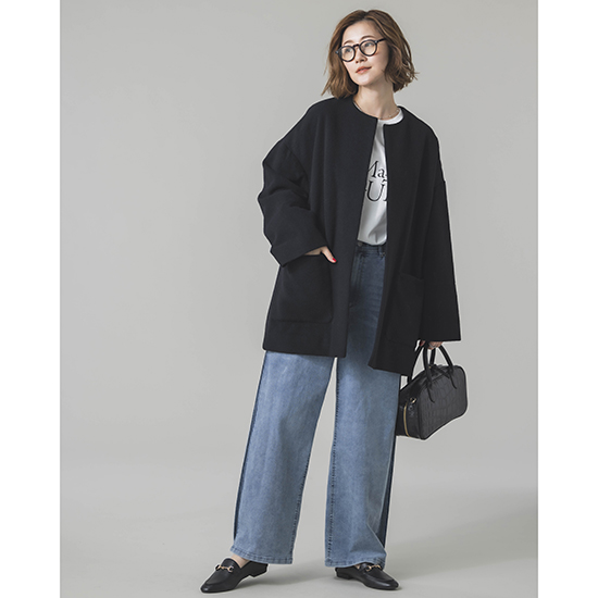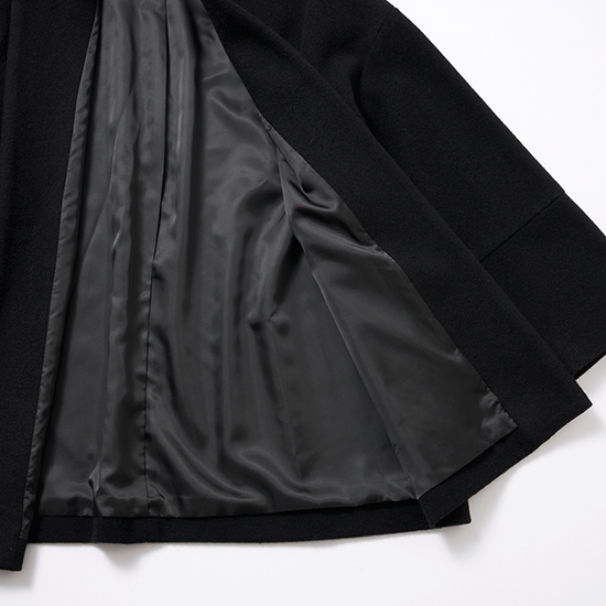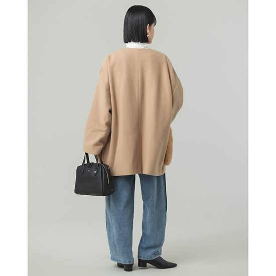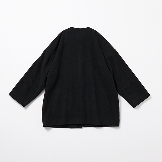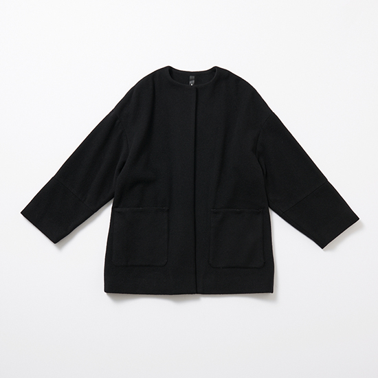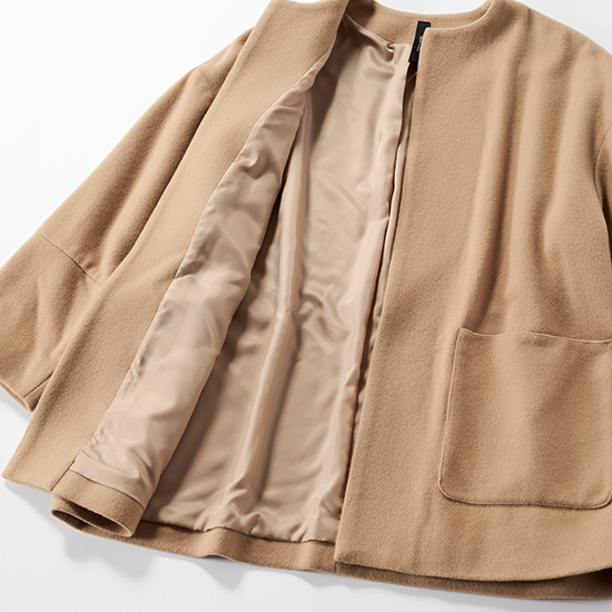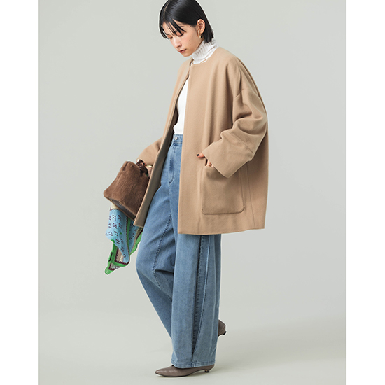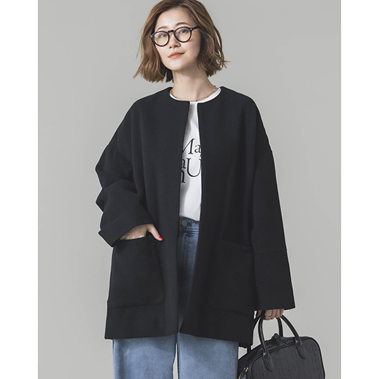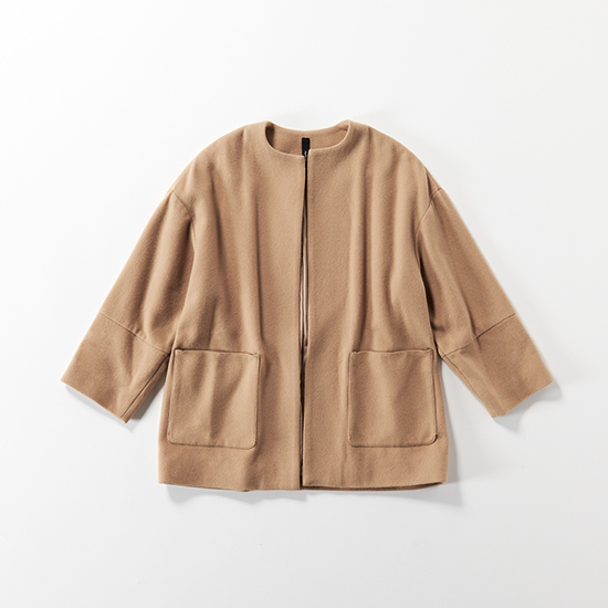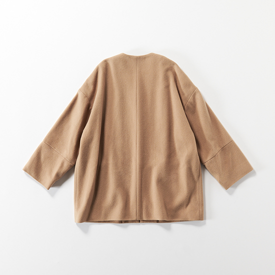 ウール混の滑らかな生地が高級感のあるノーカラーコート。