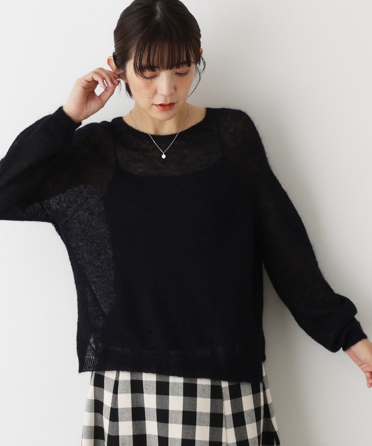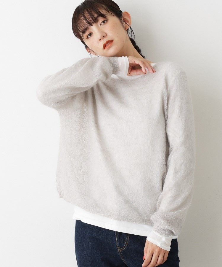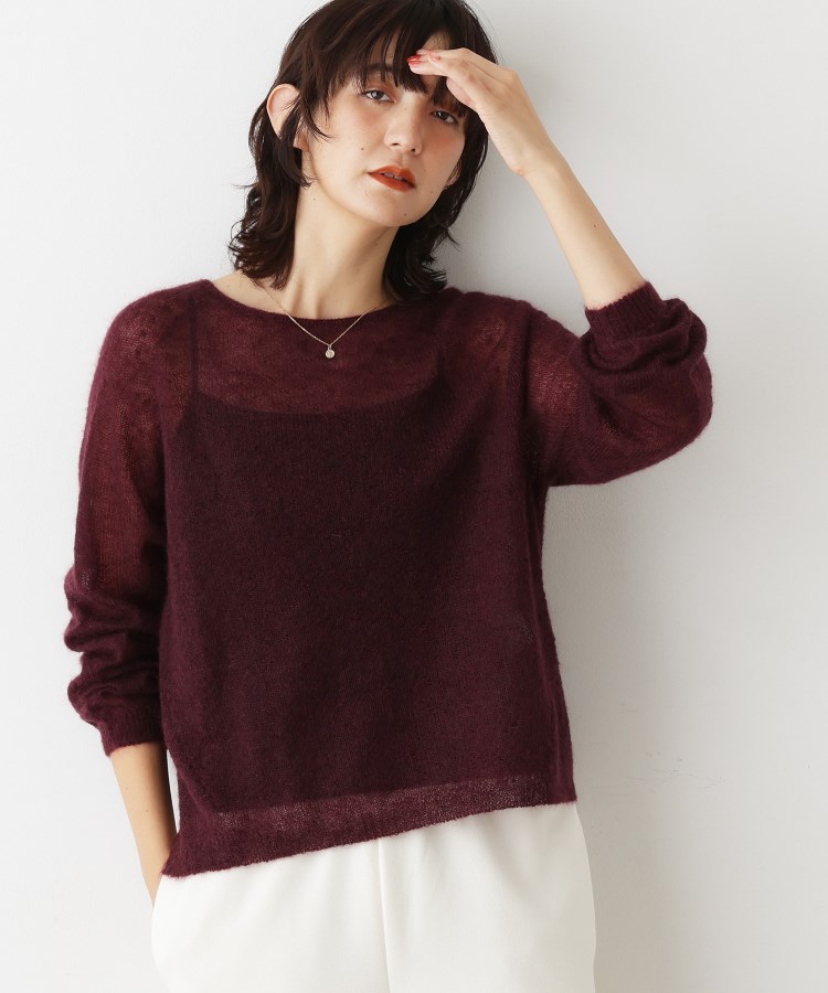 【デザインポイント】身巾をゆったりとり、着丈の短いシルエットにしています。両脇の裾部分には編地で柄を入れて、アクセントを付けています。襟はボートネックになっています。【スタイリングポイント】重ね着を楽しんでいただけるように、ざっくり編んで透け感のあるニットに仕上げています。【素材ポイント】アンゴラヤギから採れるモヘヤに、ウール混とナイロンをブレンドした糸を使用しています。糸自体を起毛することで毛足を出しています。滑らかな手触りと、上品な光沢が特徴です。その糸を甘くざっくり編むことでとても軽く、透け感のあるニットに仕上げています。※照明の関係により、実際よりも色味が違って見える場合があります。また、パソコン・スマートフォンなどの環境により、若干製品と画像のカラーが異なる場合もございます。