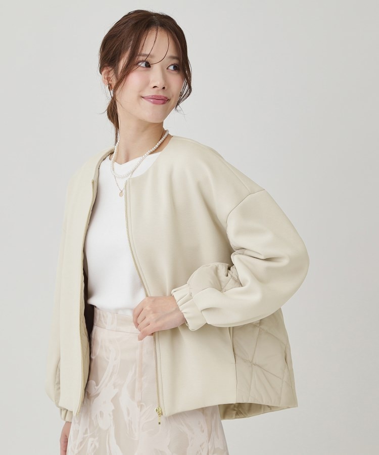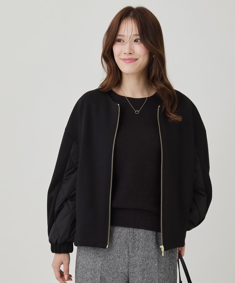 〇デザインポイントトレンドの異素材ドッキング中綿キルティングブルゾンです。タンボールニット素材を組合せてカジュアルすぎないキレイ目な雰囲気に。ノーカラーの大きすぎないリラックスしたシルエットでこなれ感を出しました。パンツやナロースカートなどスタイリングし易いいアイテムです。軽さと温かさを兼ね備えたブルゾンは、秋口の少し肌寒くなってきた日に1枚あると便利なアイテムとしておすすめです。〇素材ポイント本体はダンボール素材でポリエステル、レーヨン、ポリウレタンを使用。詰物は中綿ポリエステル素材。【仕様】・ポケット数:横×2・裏地あり※照明の関係により、実際よりも色味が違って見える場合があります。また、パソコン・スマートフォンなどの環境により、若干製品と画像のカラーが異なる場合もございます。