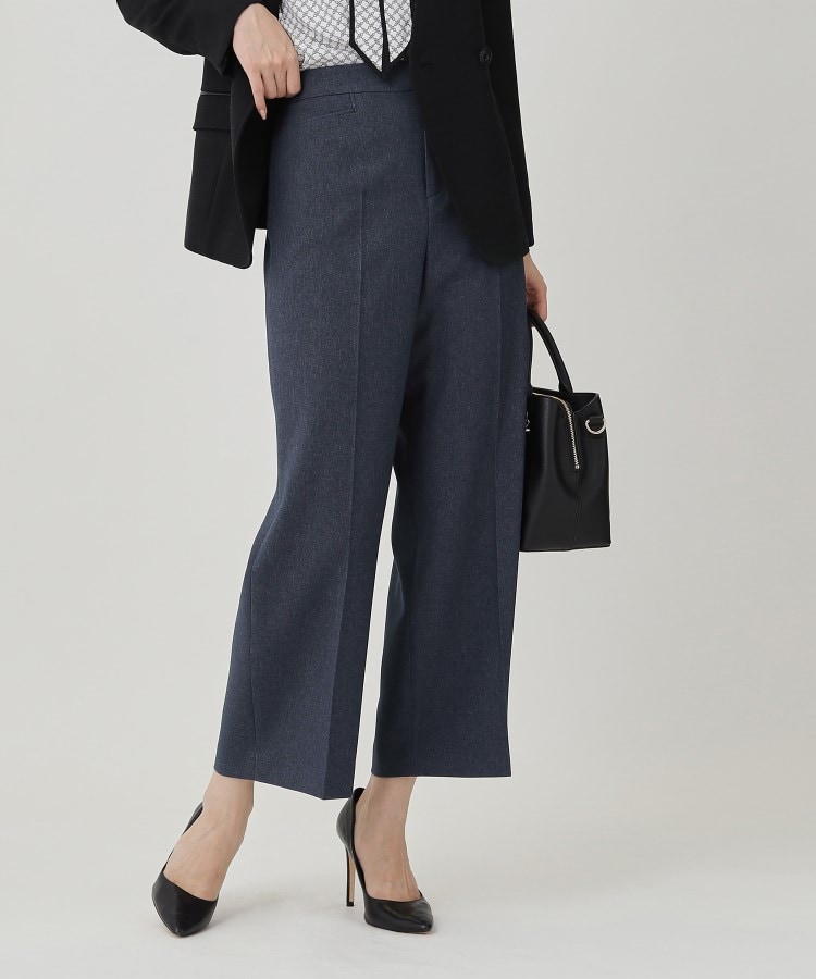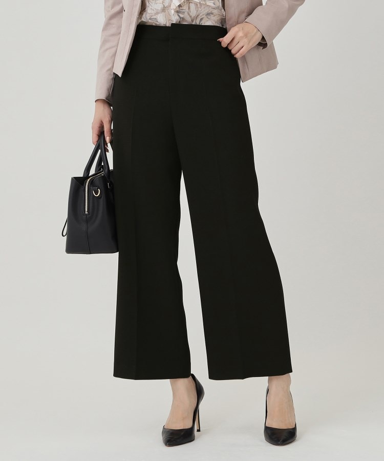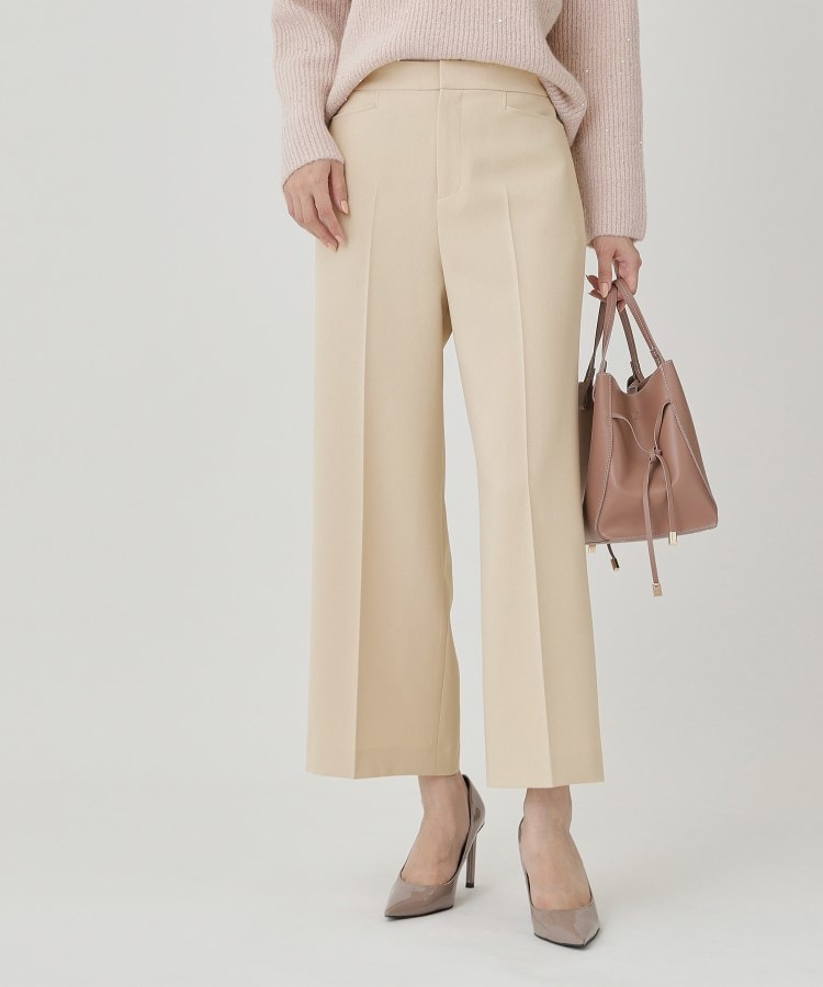 〇デザインポイントクードシャンス定番のセンタープレスのストレートワイドパンツです。従来よりもヒップ周りのツッパリを改善、前ウエストのダーツをなくしスッキリさせシルエットを進化させました。後ろウエストにやんわり平ゴムを入れで程よく身体になじむような着心地にしています。〇素材ポイントポリエステルを使用したウールライクストレッチ素材です。【仕様】・ポケット数:横×2・前ファスナー・裏地なし※グレージュ(050)はやや透け感があるため、インナーの着用をおすすめします。※照明の関係により、実際よりも色味が違って見える場合があります。また、パソコン・スマートフォンなどの環境により、若干製品と画像のカラーが異なる場合もございます。