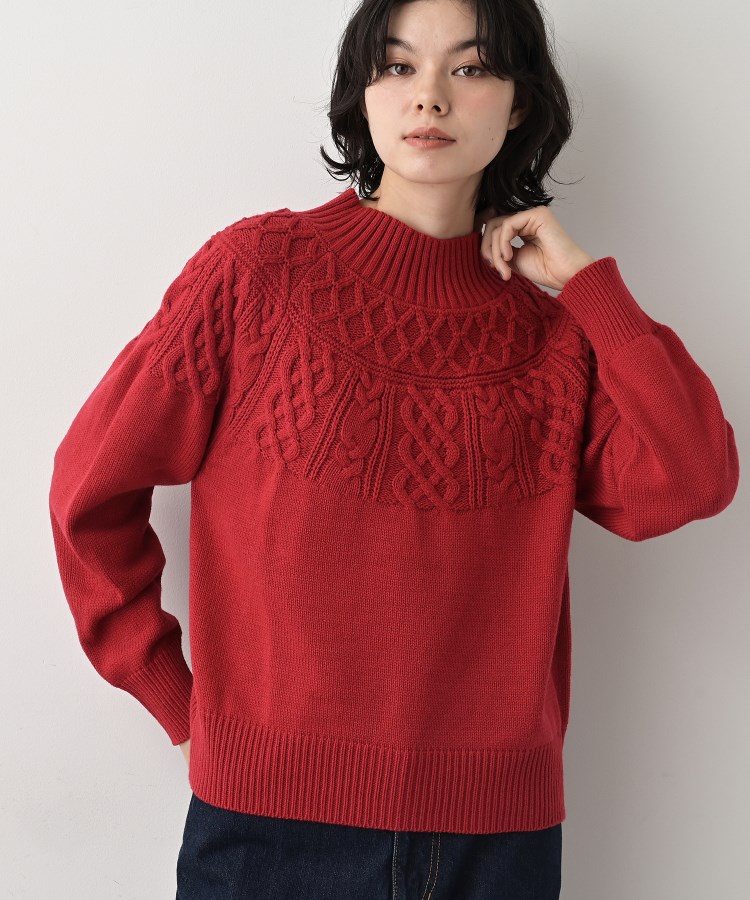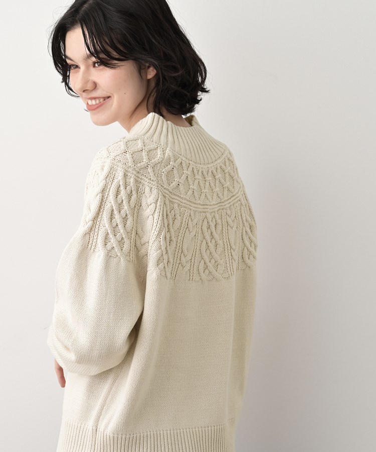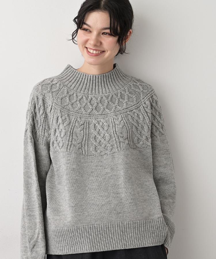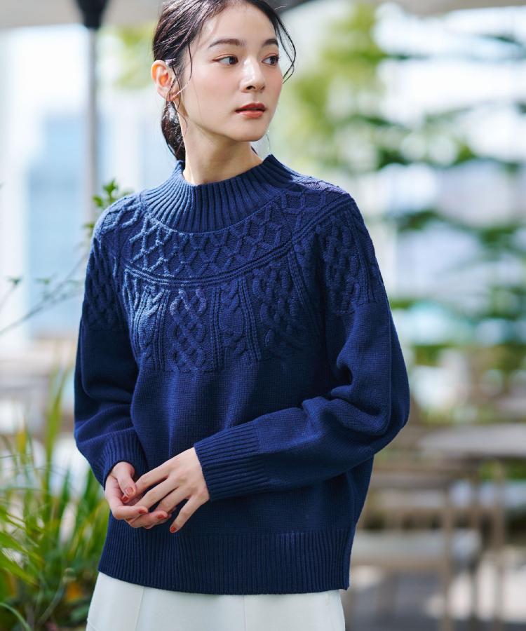 【デザインポイント】胸元から型にかけて広がる求心編のケーブル柄。立体感とクラシックな表情を演出します。リブ編のハイネックが首元をやさしく包み込み、暖かさと上品さを両立します。袖口と裾のリブですっきりまとめ、着膨れしにくいきれいなラインに仕上げています。【スタイリングポイント】チェック柄や無地のスカートと合わせたフェミニンカジュアルスタイルがおすすめ。ワイドパンツやデニムと合わせてカジュアルスタイルも◎【素材ポイント】ウールブレンドの柔らかく暖かみある素材です。※照明の関係により、実際よりも色味が違って見える場合があります。また、パソコン・スマートフォンなどの環境により、若干製品と画像のカラーが異なる場合もございます。
