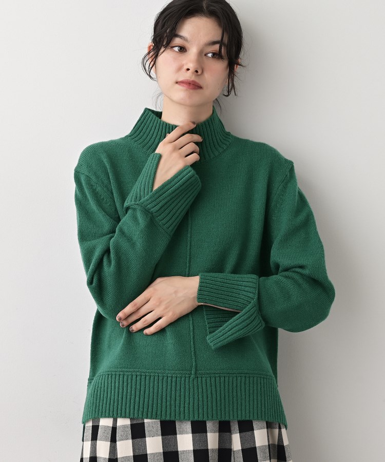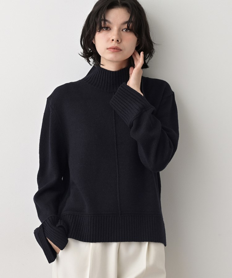 【デザインポイント】リラックス感とモードな雰囲気を併せ持つハイネックプルオーバー。身幅広めのゆったりシルエットに、後ろ着丈がやや長めのデザインになっています。センタータックラインが印象的なアクセントでスタイルをすっきり見せてくれます。袖と裾リブのスリットが抜け感と動きをプラスして軽やかな印象に。【スタイリングポイント】どんなボトムスとも相性良く、着こなしの幅が広いのが魅力。裾にサイドスリットが入っていることにより前だけ軽くタックインしやすく、スタイリングバランスも取りやすい設計になっています。大人のデイリーカジュアルを叶える1枚です。【素材ポイント】ウール混に、バルキー加工したアクリル素材をブレンドした糸を使用しています。通常のウール混アクリルよりも膨らみがあり、軽さとボリューム感が特徴です。ウールは、動物愛護の観点から、ノンミュールジングという方法で飼育された羊の羊毛を使用しています。※照明の関係により、実際よりも色味が違って見える場合があります。また、パソコン・スマートフォンなどの環境により、若干製品と画像のカラーが異なる場合もございます。