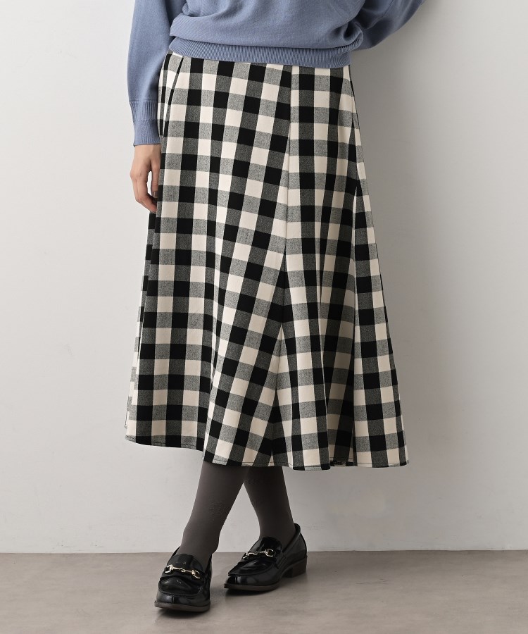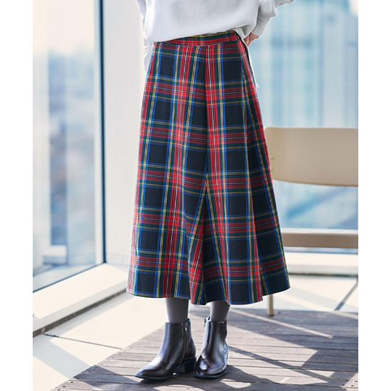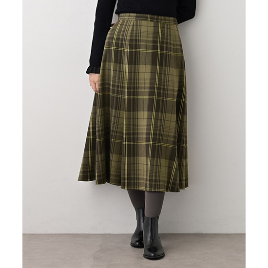 【デザインポイント】オリジナルのチェック柄を使用したフレアスカートです。全体的なフレアに加えて裾に向かって少しボリュームが出るようなデザインで、きれいなシルエットが定評です。【スタイリングポイント】ニットやカジュアルなスウェットにも合わせやすいスカートです。暗くなりがちな冬のスタイリングにプラスして華やかな印象に。【素材ポイント】Dessinオリジナルのチェック柄で、表面に起毛が入っており暖かみのある着心地のよい素材感です。【仕様】・ポケットなし・左脇ファスナー・ウエスト後ろゴム・裏地あり※照明の関係により、実際よりも色味が違って見える場合があります。また、パソコン・スマートフォンなどの環境により、若干製品と画像のカラーが異なる場合もございます。