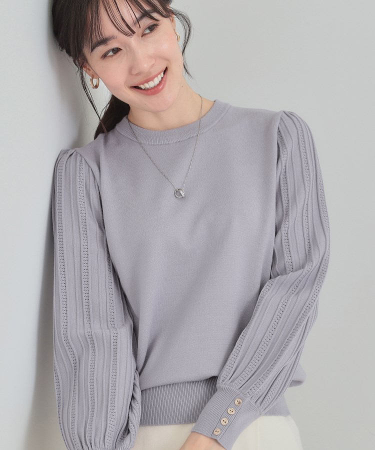 【デザイン】本体はすっきり、袖は編み柄を施した、一枚でサマ見えするセーター。お袖のふんわりシルエットと編み柄でボリュームがある分、身頃をすっきりシルエットにすることで、コンパクト見えに。通勤やおでかけシーンにおすすめのアイテムです。【スタイリング】コンパクト見えなので、ボトムはテーパードやワイドパンツがバランスよく着ていただけます。ナロースカートならすっきり。プリーツやギャザーなどボリュームシルエットのスカートならフェミニンな印象になります。【素材】柔らかく肌触りが心地よい糸で編み立てています。※照明の関係により、実際よりも色味が違って見える場合があります。また、パソコン・スマートフォンなどの環境により、若干製品と画像のカラーが異なる場合もございます。