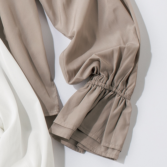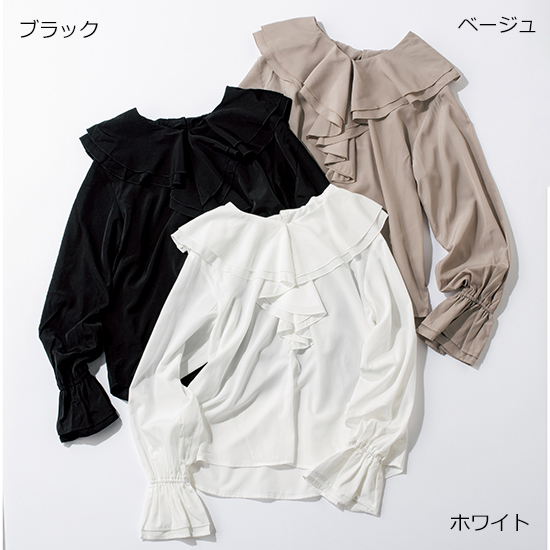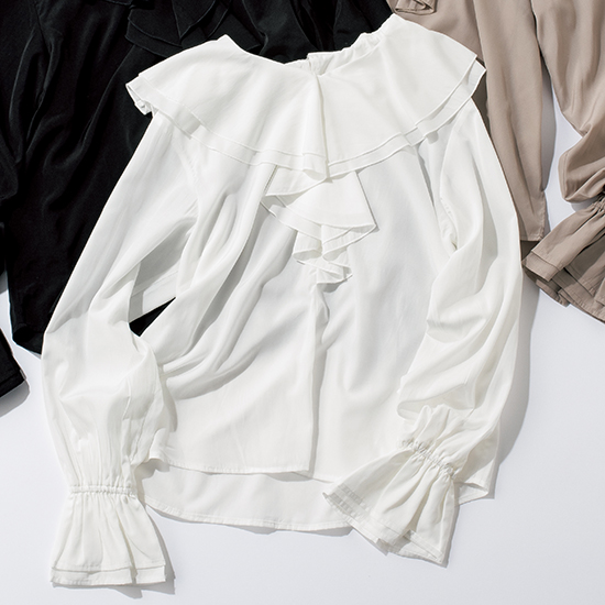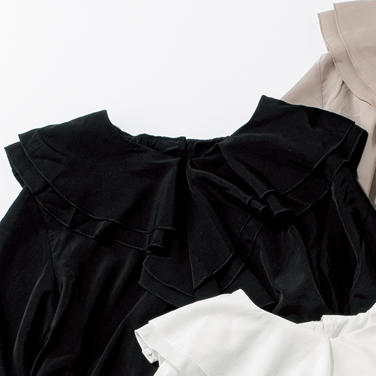 襟と袖には二重のフリルをあしらい、後ろ襟は涙開き仕様で、レイヤードコーデでも襟をきれいに見せられるよう工夫されています。