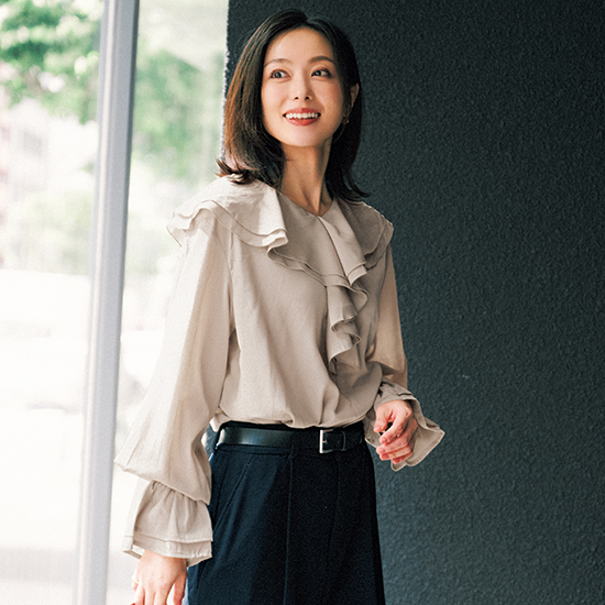 ・落ち感のあるなめらか素材は甘いフリルデザインでも大人っぽく着られる。