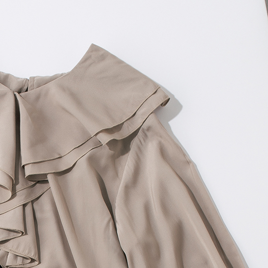 大きめのラッフルカラーが顔まわりを華やかに演出し、女性らしい印象を引き立てます。