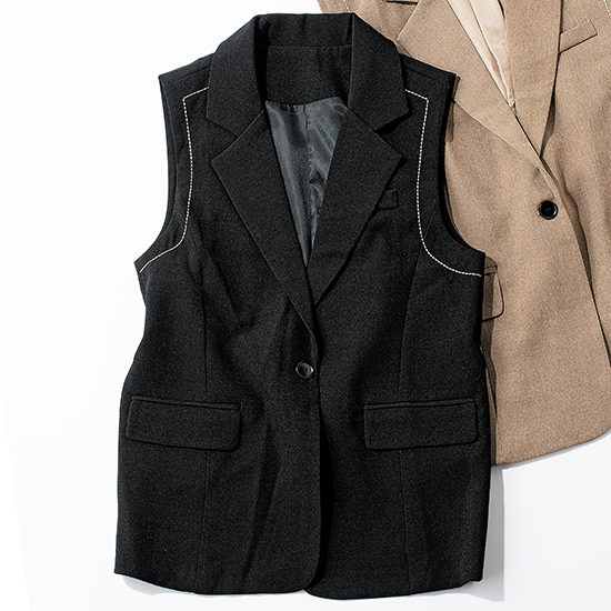 ・きちんと見えするロングジレは仕事、休日も活躍。<br />