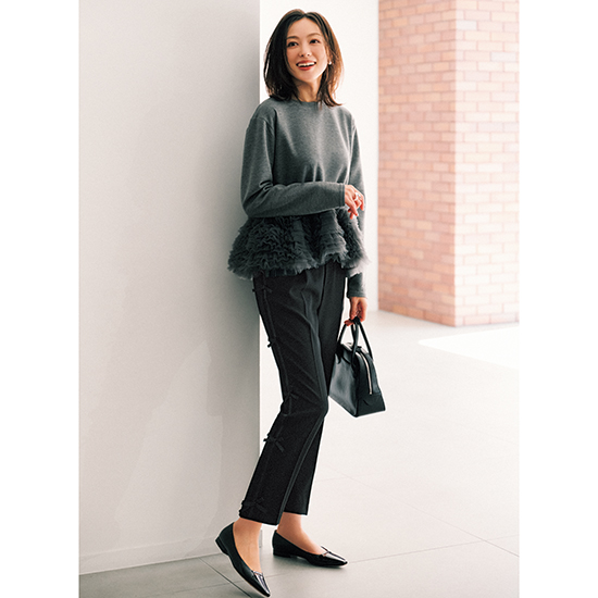 ・裾のフリルがシンプルコーデにほんのり甘さを加える。