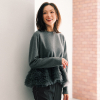 裾にたっぷりついたフリルがペプラム状に広がる上品見えトップス。