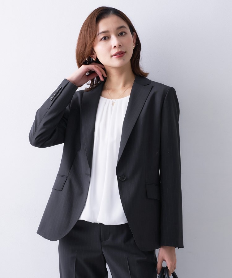 【デザイン】スーツセットアップの定番のテーラードジャケット。すっきりとした美しいシルエットとシャープな衿元の上品なジャケットに仕上がっています。また、裏地の配色も目を惹くポイントに。今シーズンは、ストライプ柄と無地2色の展開です。【素材感】欧州(トルコ)最大級梳毛メーカーYUNSAのプレミアムラインのスーツ素材。紡績から織りまで一貫で行うメーカーで、独自の紡績技術にたけており、ウール100%でありながら適度なストレッチ性を出しているのが特徴。原毛の良さからくる上品な光沢感と柔らかい風合いが高級感を醸し出し、オールシーズン着用できる肉感で非常に仕立て映えの良い素材になります。【着こなしポイント】同素材のプレミアムテーパードパンツ(商品番号:163-61033)とプレミアムタイトスカート(商品番号:153-71033)との合わせがおすすめです。裏地にキュプラを使用し、ワンランク上のスーツシリーズです。【仕様】・ポケット数:横×2 内側×1・裏地:背抜き仕立て※照明の関係により、実際よりも色味が違って見える場合があります。また、パソコン・スマートフォンなどの環境により、若干製品と画像のカラーが異なる場合もございます。