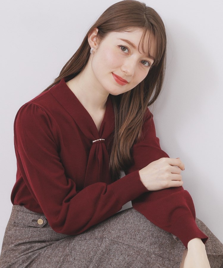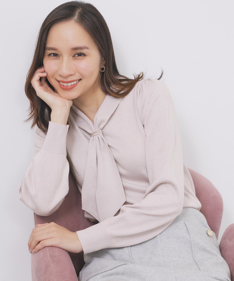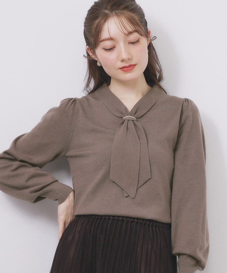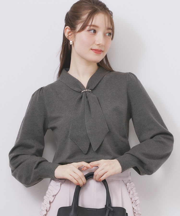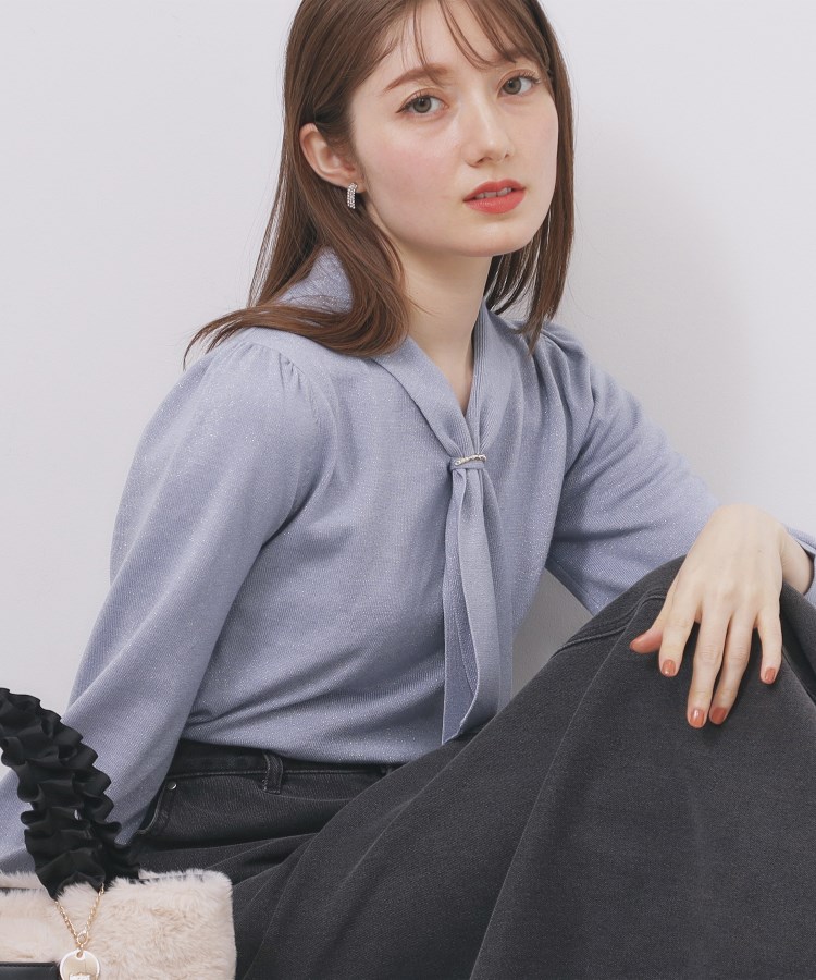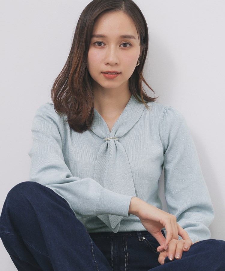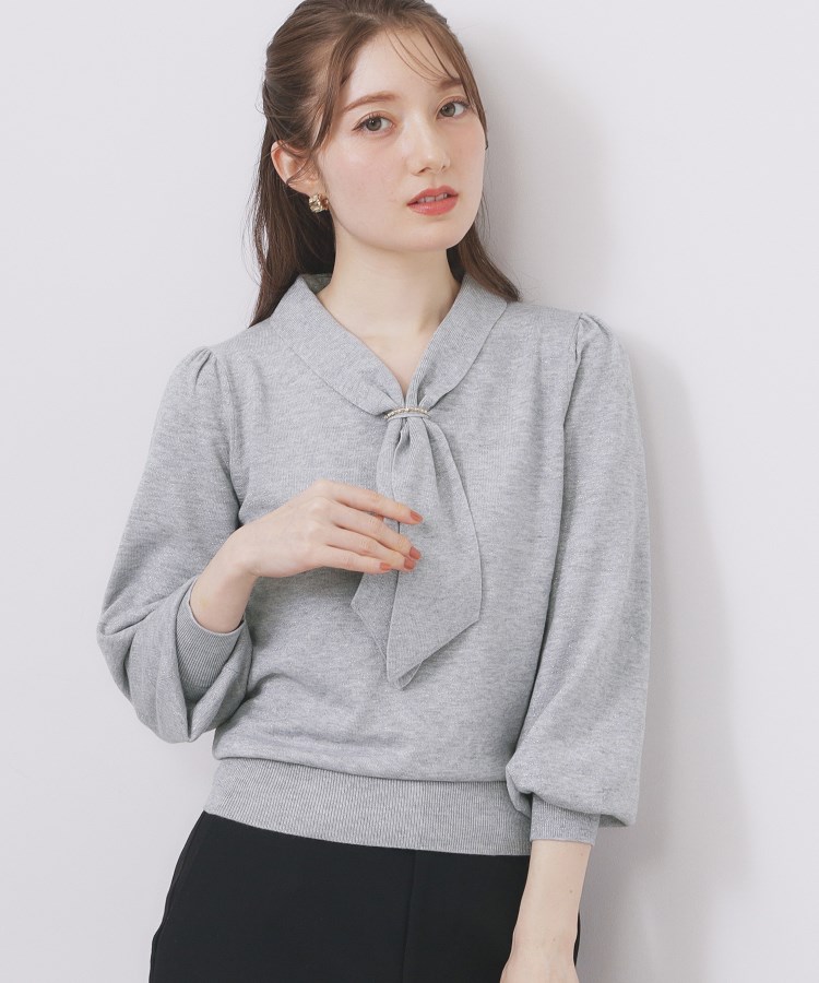 ボウタイにフェイクパールとビジューがミックスになったゴールドパーツが顔周りに華やぎを与えてくれるデザインニット【デザイン】・ボウタイ風の華やかなデザインニット。・タブの部分に着映えるコールド×フェイクパールのパーツがあしらわれていて、顔周りに華やぎを与えてくれます。・トレンドの繊細なラメ混と、ラメ無し、バイカラーのアソート展開で、TPOに合わせてコーディネイトしていただけます。・すっきりとコンパクトなシルエットに、ふんわりとした程良いボリューム袖もポイント。・ボウタイはタック風に差し込んだりラフに差し込むことで表情に変化が出ます。・リモートワークや通勤、ちょっとしたお出かけにもオススメの一枚です。【素材】・膨らみのある暖かな毛混の4者混の糸を使用。・ラメ混とラメなしの展開で、どちらも風合いが柔らかく肌触りの良いのも嬉しいポイント。・マシンウォッシャブル機能付きで、ご自宅で簡単にお手入れしていただけます。【カラー】グレージュ(650)、ブルー(691)、グレー(812)、ライトピンク(870)、サックスブルー(890)のカラーにはラメが入っております。※照明の関係により、実際よりも色味が違って見える場合があります。また、パソコン・スマートフォンなどの環境により、若干製品と画像のカラーが異なる場合もございます。