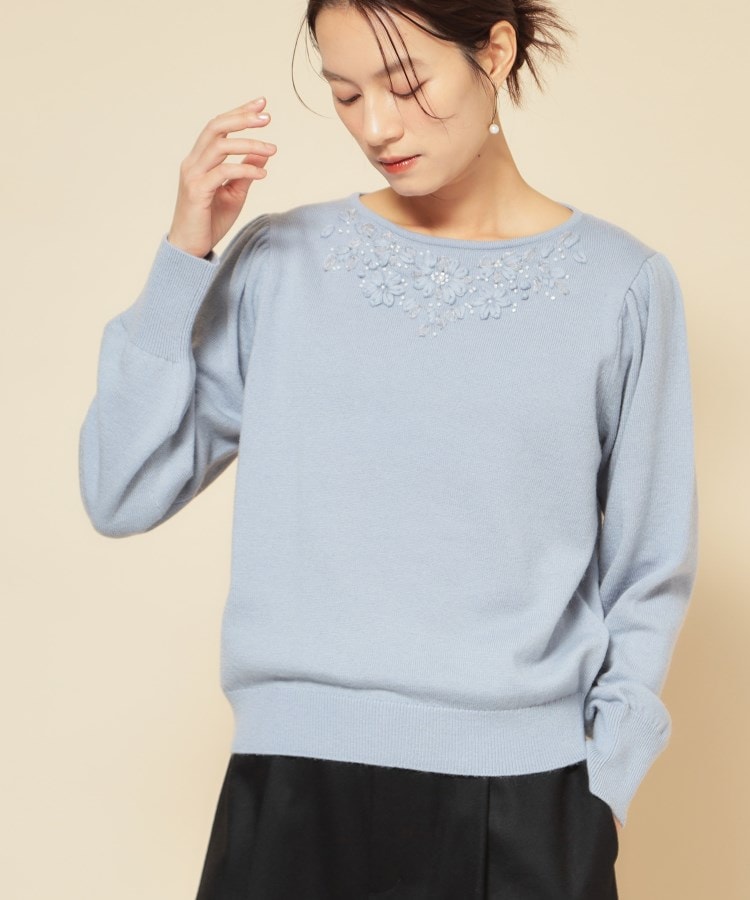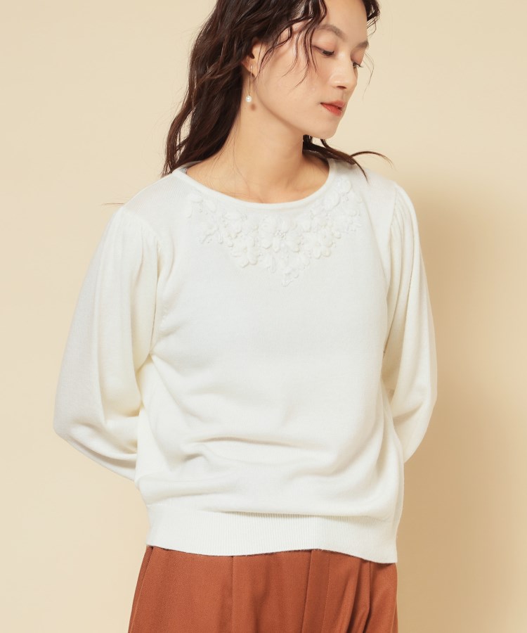 【デザイン】共糸で丁寧に施した手刺繍が目を引くハンドクラフトニット。オーガンジーテープをあしらい、フェイクパールやビーズを散らした繊細で華やかなデザインが上品な印象です。大人の女性にも着こなしやすいお花のボリューム感や色合いに拘りました。袖は程よくゆとりのあるパフスリーブで、女性らしい柔らかなシルエットを演出します。アームに程よくゆとりを持たせたデザインで、気心地の楽さを出しつつ、袖リブを絞って手首をほっそりと見せてくれます。【素材】ふんわりとした手触りで秋冬を感じさせる素材感でありながら、ハイゲージで薄めの肉感が秋から冬を通して着て頂ける素材感のニットです。【着こなしポイント】お勧めスタイルは、フレアースカートやタイトスカートなどの、上品でフェミニンなコーディネート。ワイドパンツにもバランス良く合わせられるデザインで一枚で華やかさを添えつつ、幅広いボトムスと合います。ウエストのリブで丈の調整が可能なので、スタイルに合わせた着こなしをお楽しみ頂けます。※照明の関係により、実際よりも色味が違って見える場合があります。また、パソコン・スマートフォンなどの環境により、若干製品と画像のカラーが異なる場合もございます。