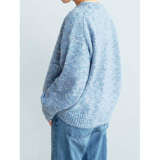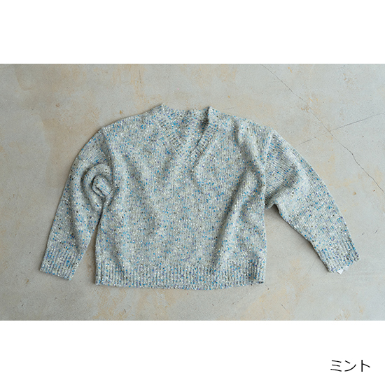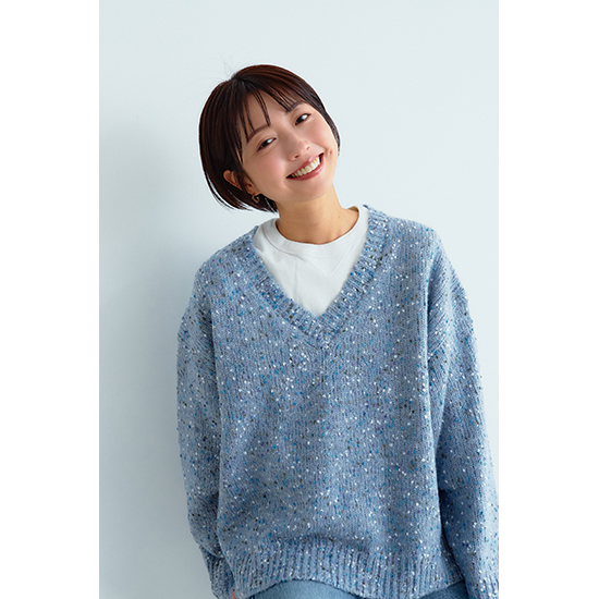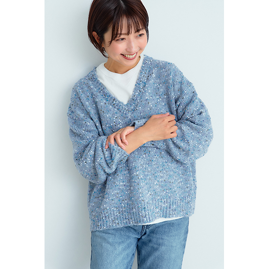 <p><font color=#c31941 size=3>可愛いネップ毛糸で、冬の地味見えコーデをオシャレに変身</font><br><br>単色のモノトーンコーデが増えてしまうこの季節。<br>上品で可愛いブルーグレー系をプラスしませんか?<br>ブルーのネップがコーディネートを可愛い印象に。<br>V開きの首元が、デコルテ周りをスッキリ見せてくれます。<br>シャツやブラウスの上に、また、ロンTに重ねるだけで、いつものカジュアルをちょっとオシャレに見せてくれます。<br>ボトムはデニムはもちろん、黒やブラウンのパンツにも似合い、ボリュームスカートにもシックリ。</p>