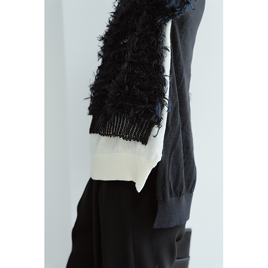 <p><font color=#c31941 size=3>濡れ羽色のような艶めき、大人のためのレイヤードニット</font><br><br>毛足の長いシャギーヤーンが作る立体感のある編み地が繊細に光を受けて表情を変え、濡れ羽色のような艶めきが特別感を演出。<br>前身頃と袖、背面は薄手ながら保温力のあるアルパカウールで、冬でも快適に着ていただけます。<br>レーシーで透け感の裾に、袖口とネック部分はラメコイルヤーンを効かせ、ヴィンテージライクな光沢とさりげない煌めきで上品なアクセントをプラス。<br>華やかさと上品さが重なり合い、着るだけで冬の装いを格上げする一枚です。</p>