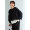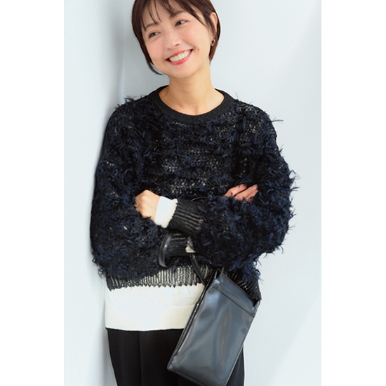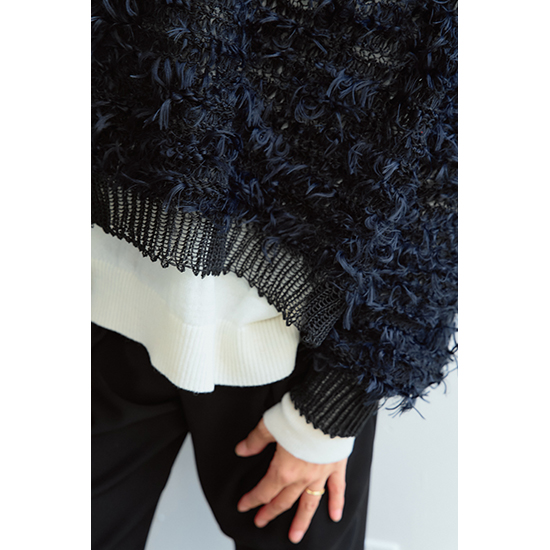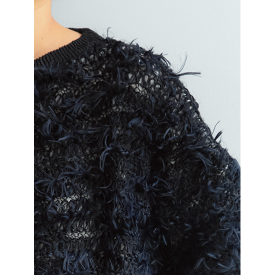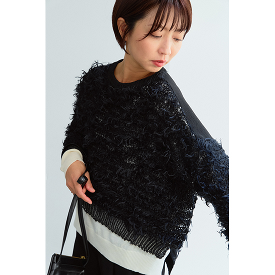 毛足の長いシャギーヤーンが作る立体感のある編み地が繊細に光を受けて表情を変え、濡れ羽色のような艶めきが特別感を演出。