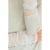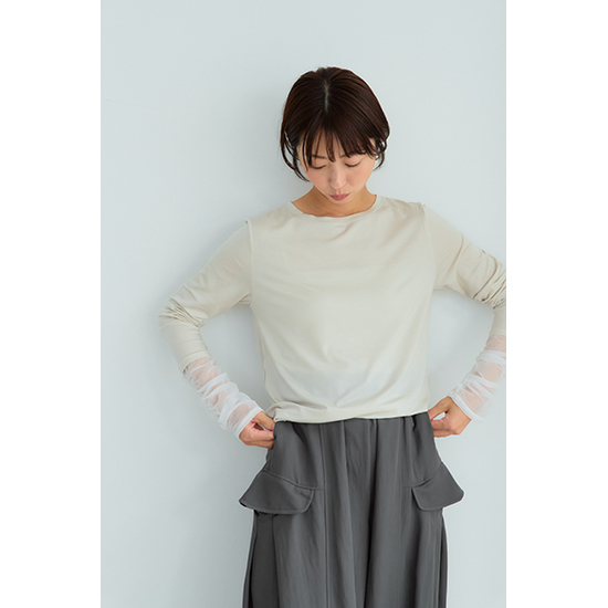 シアー部分が女性らしいフェミニンな印象で、袖口からシアー部分を出すスタイリングが可愛い1枚です。