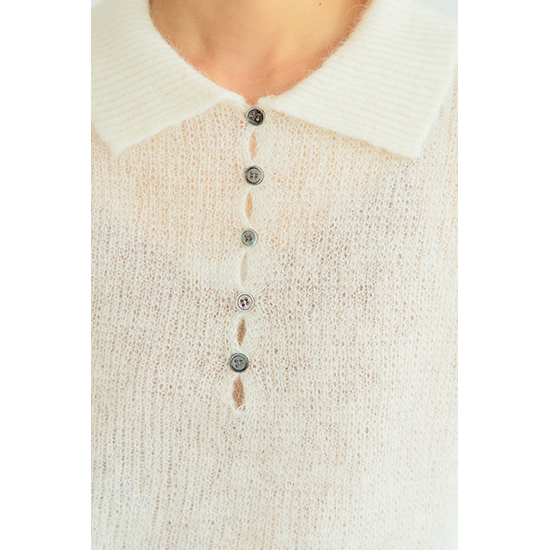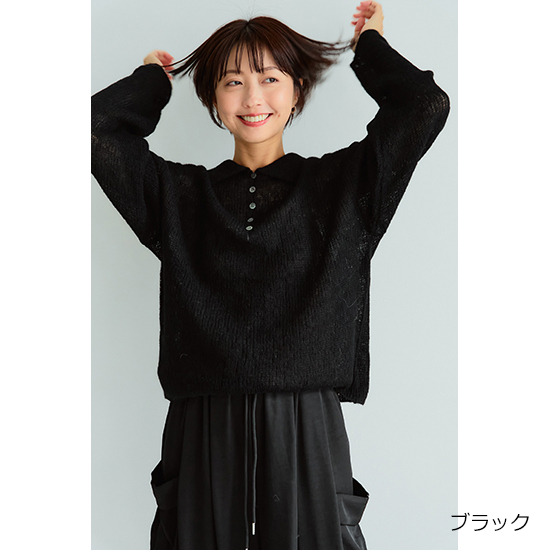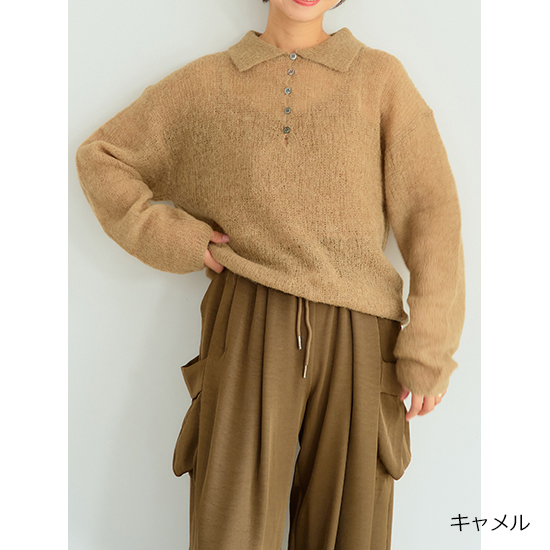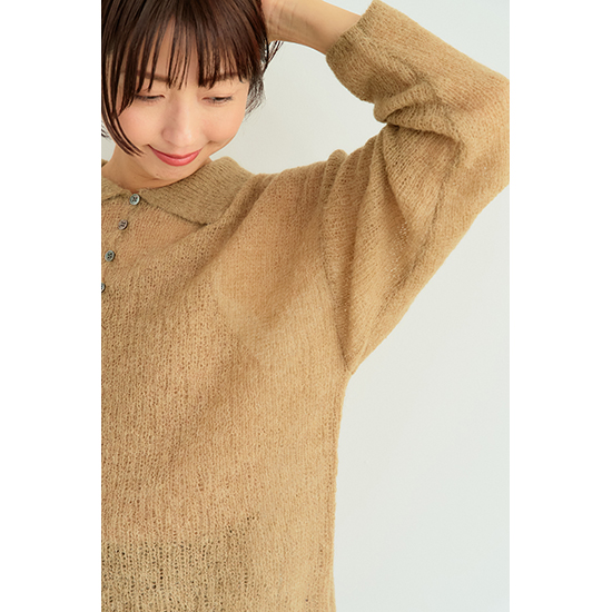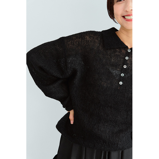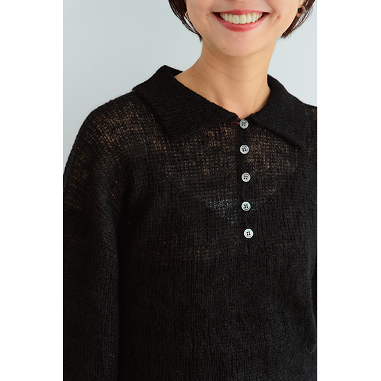 程よいシアー感とあった紙のある素材を使用したポロ衿ニット