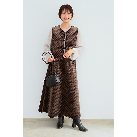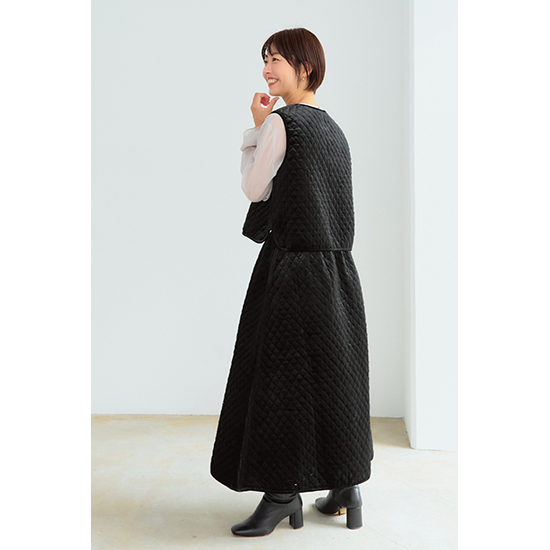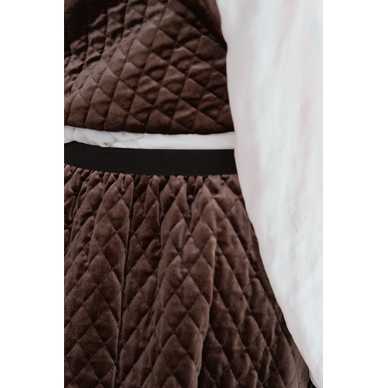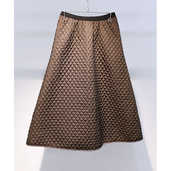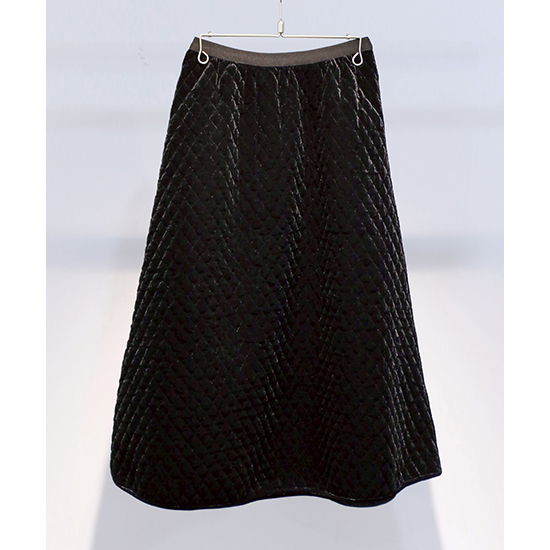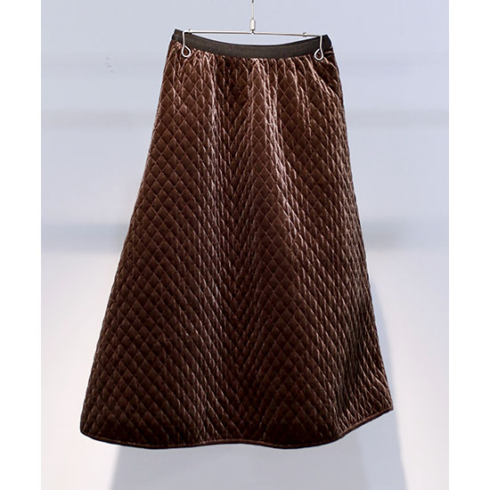 トレンド感のあるベロア生地をキルトで表現することで、立体感のあるフレアシルエットを表現しています。裏表のリバーシブルで着用いただけます。