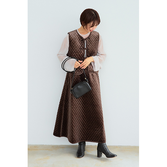 トレンド感のあるベロア生地をキルトで表現することで、立体感のあるフレアシルエットを表現しています。裏表のリバーシブルで着用いただけます。<br />