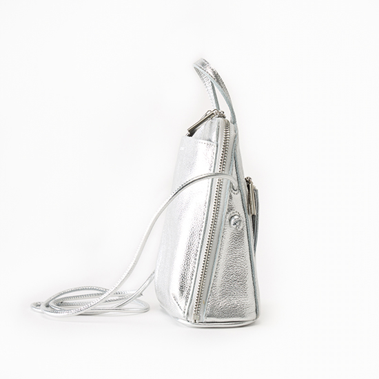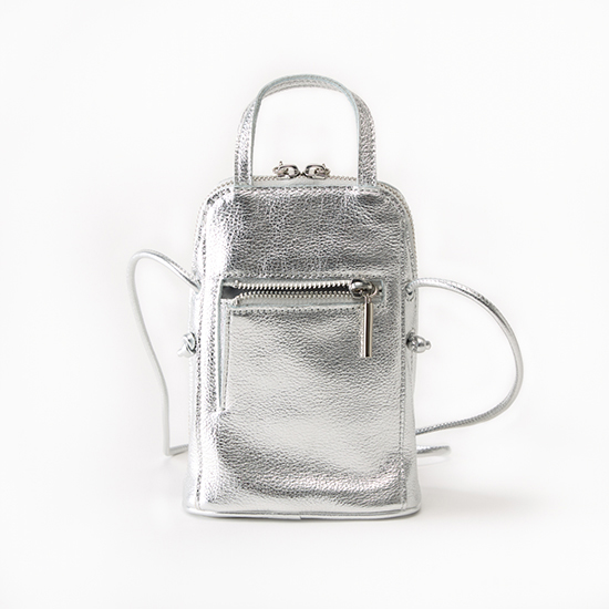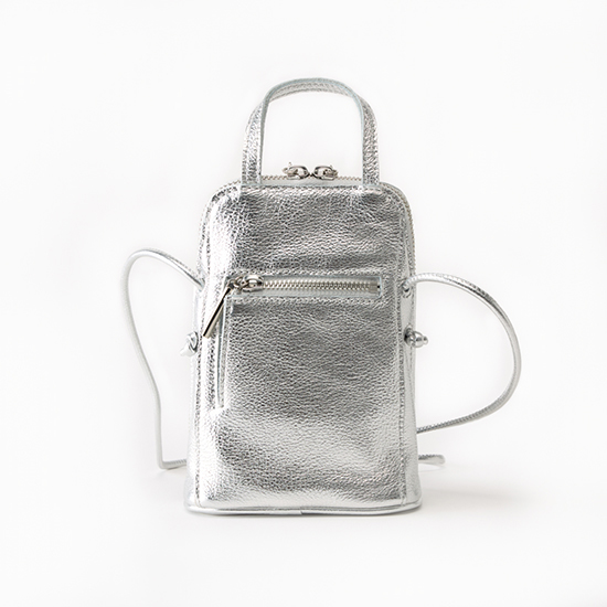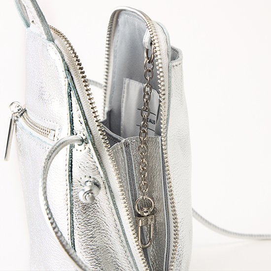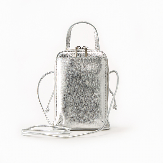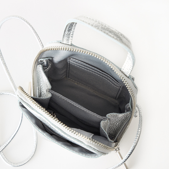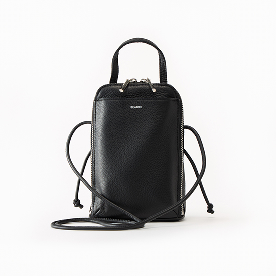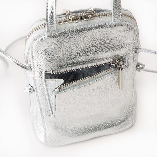 ファスナーポケットには見た目以上に小物がしっかり入る、タテ型のスリムシルエットのミニショルダー。
