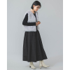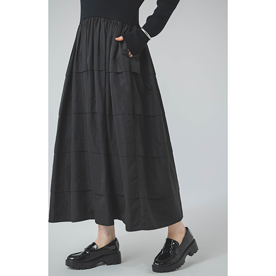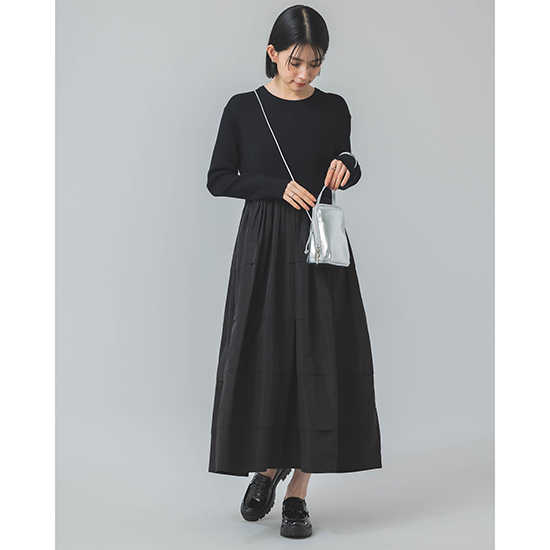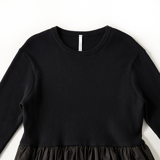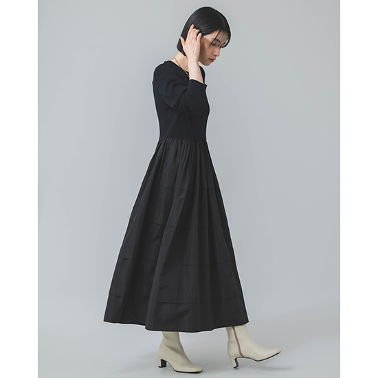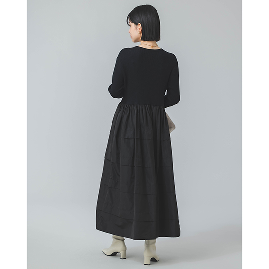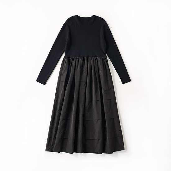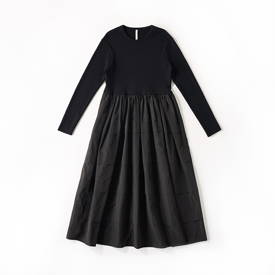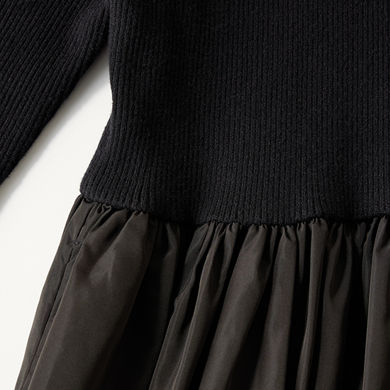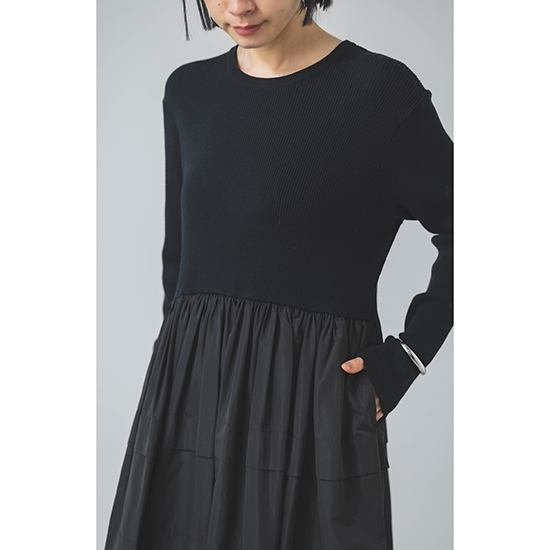 上半身はリブニット、スカート部はボリュームある布帛で仕上げたドッキングワンピース。