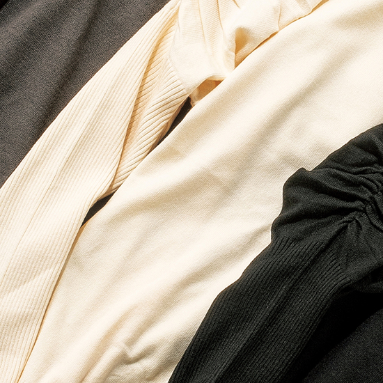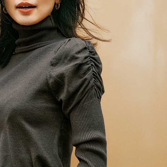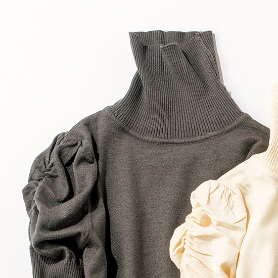 インナーとしても重宝するタートルニットは、肩のギャザーや袖口の