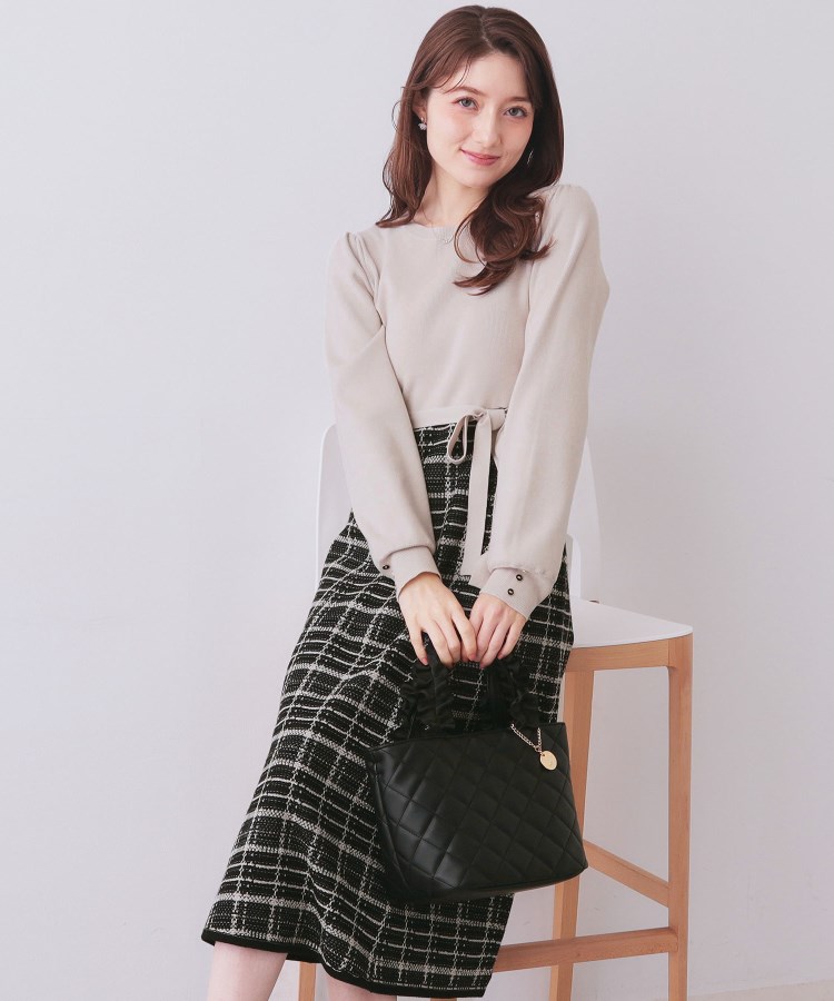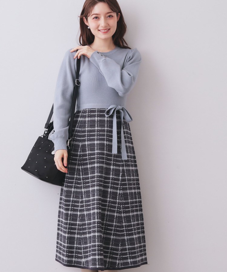 ジャカードチェックとシンプルなクルーネックが織りなす、洗練と華やぎを両立するニットワンピース。【デザイン】・トップス部分はミニマルなクルーネックでデコルテラインをすっきりと見せ、知的で上品な印象を演出。・肩にあしらわれた控えめなギャザーが、女性らしい柔らかな雰囲気をプラスし、立体的なシルエット感を引き出します。・スカート部分はラメを織り交ぜたチェックジャカード素材で、動くたびに繊細な光を放ち、シーズンムードを盛り上げる華やかさが魅力。・ウエストゴムなしとは思えないほど、体のラインを拾いすぎないキレイなシルエットで、程よくフィットする楽ちんな着心地がポイント。・紐ベルトが添えられており、気になるおなか周りもさりげなくカバー。【素材】・トップス部分はしなやかなニット素材を採用。フィット感がありながらも動きやすく、快適な着心地を実現。・スカート部分のジャカード素材は、表情のある立体的な編地が上品感を引き出し、1枚でコーディネートが完成する特別な仕上がりに。・ハンドウォッシャブル対応でありながら、洗練されたデザイン性を楽しめます。【仕様】・ポケットなし・裏地なし※照明の関係により、実際よりも色味が違って見える場合があります。また、パソコン・スマートフォンなどの環境により、若干製品と画像のカラーが異なる場合もございます。