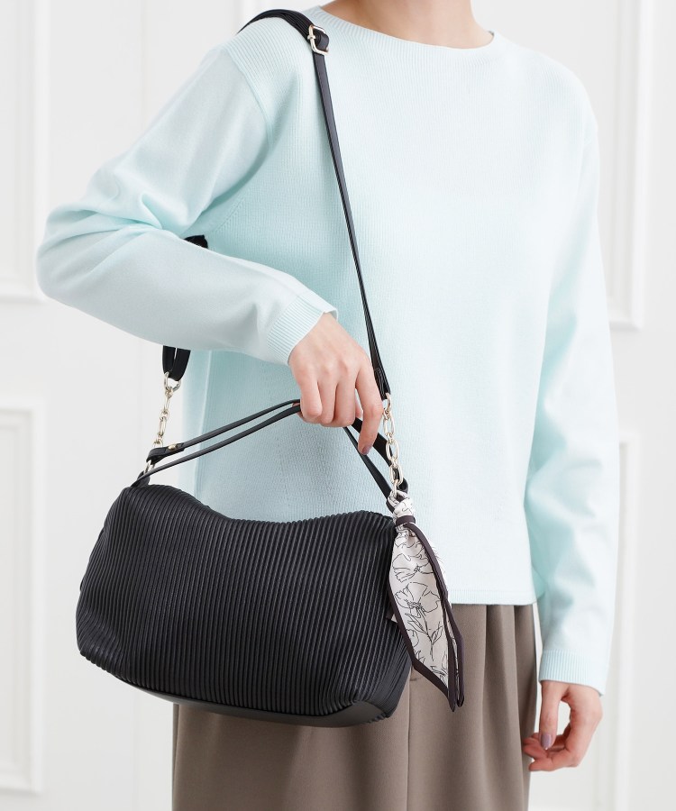 【デザイン】プリーツデザインが上品なハンドル付きショルダーバッグ。柔らかい質感と光沢感が、大人っぽく持つだけでスタイリングにこなれ感をプラス。軽量でマチも広く、見た目以上の収納力があるのも嬉しいポイント。スカーフ付きでアレンジができ、カジュアルにもキレイめにも合わせやすいバッグです。【仕様】・ポケット数:内側×3※照明の関係により、実際よりも色味が違って見える場合があります。また、パソコン・スマートフォンなどの環境により、若干製品と画像のカラーが異なる場合もございます。