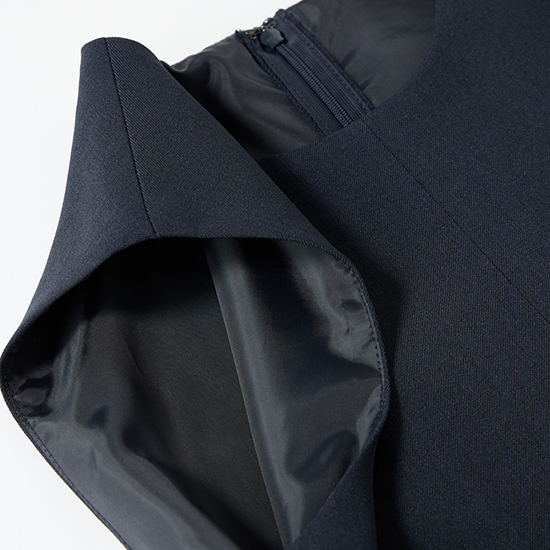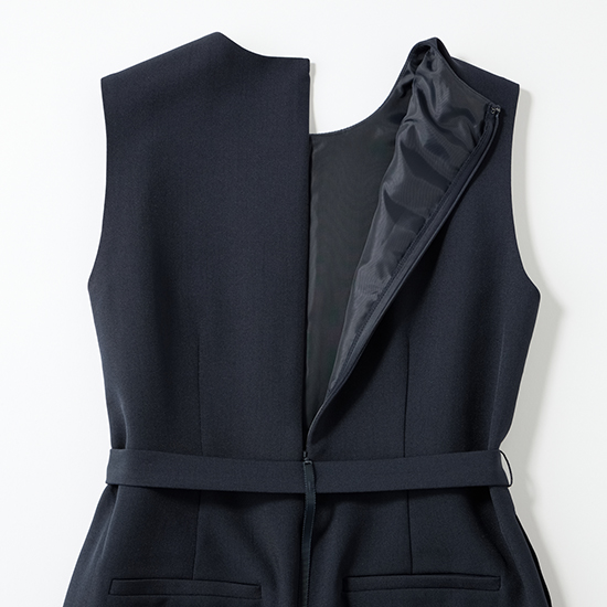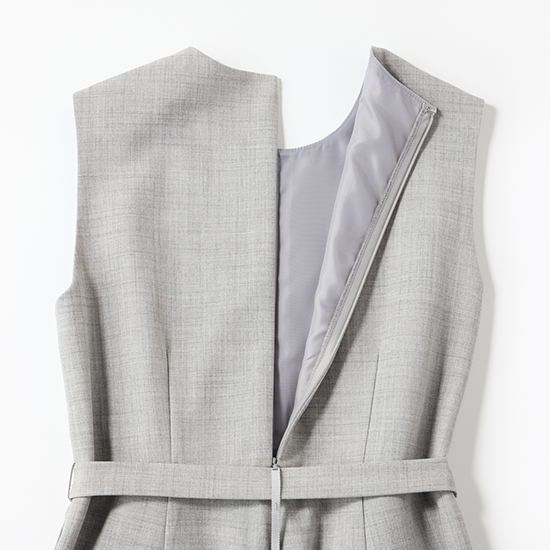 後ろファスナー仕様で、スライダー部分には飾り布をあしらい、きれい見えと着脱のしやすさを両立。