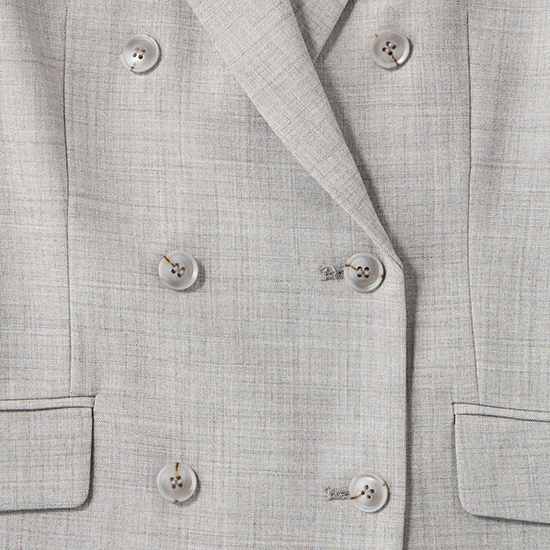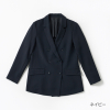 ダブルブレストのトラッドなジャケットは、絶妙なゆとりシルエットで体形カバーと