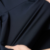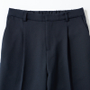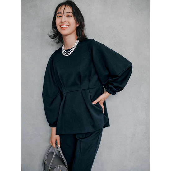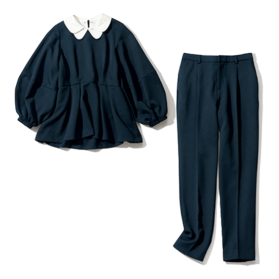 ハイウエスト位置からふんわり広がるタックデザインが印象的な衿付きブラウスと、テーパードパンツのネイビーセットアップ。