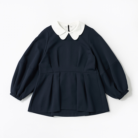 甘さときちんと感の絶妙なバランスが嬉しいセットアップの最大の魅力は、花びらのように重なる白い衿。