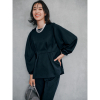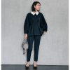 取り外し可能な衿付きブラウスと同素材テーパードパンツのセットアップ。