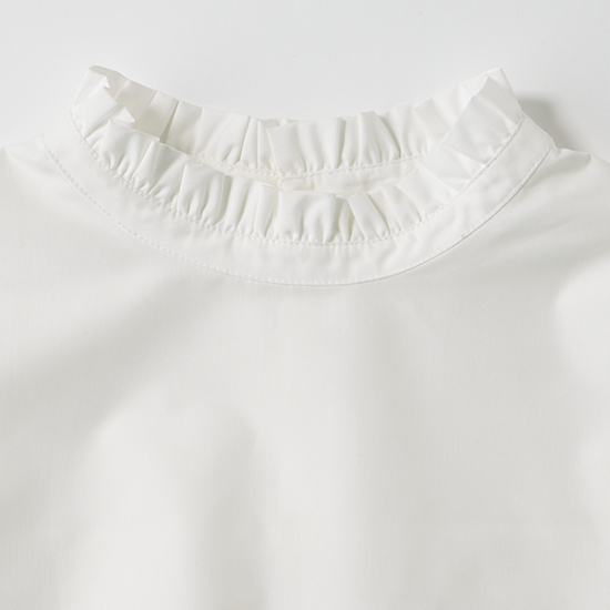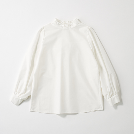 インナーのブラウスは、プチハイネックにふんわりとしたボリューム袖、衿ぐりのフリルが華やかさを添えます。