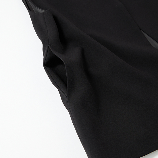 ジレのアシンメトリーなフロントデザインがスタイリッシュな印象を与えつつ、セレモニーシーンにふさわしいきちんと感を演出。