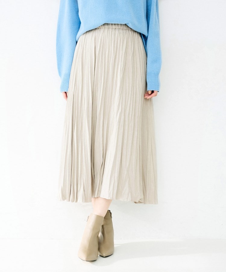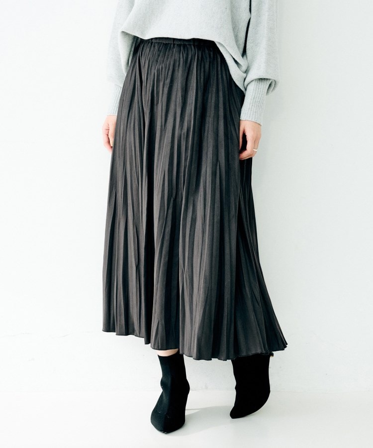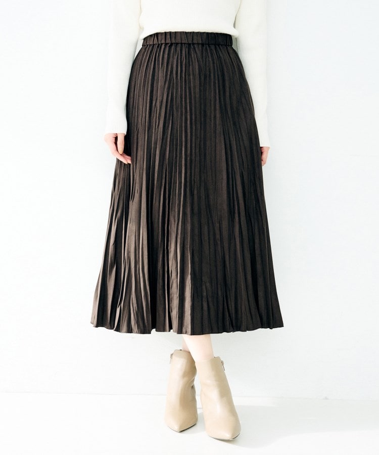 【デザイン】絞りのランダムプリーツがきれいめになり過ぎない軽やかな印象のスカート。プリーツを途中で消して裾に向けてフレア分量が出るように見えるデザインになっています。ウエストはゴムが入っているため、穿き心地も◎デイリーに活躍するプリーツスカートはどんなトップスでも好相性な着回し力の高い1枚です。【素材感】ポリエステル糸を使用したスエード風素材。起毛を施して柔らかく、なめらかな風合いに仕上げているのが特徴です。プリーツ加工を施しています。※裏地あり【仕様】・ポケットなし・ウエスト総ゴム・裏地あり※グレージュ(050)はやや透け感があります。■こちらの商品はUNTITLED店舗では取り扱いがございませんのでお問い合わせはコールセンターまで。※照明の関係により、実際よりも色味が違って見える場合があります。また、パソコン・スマートフォンなどの環境により、若干製品と画像のカラーが異なる場合もございます。