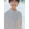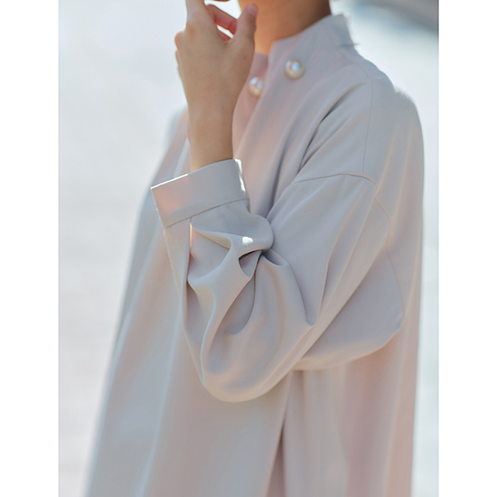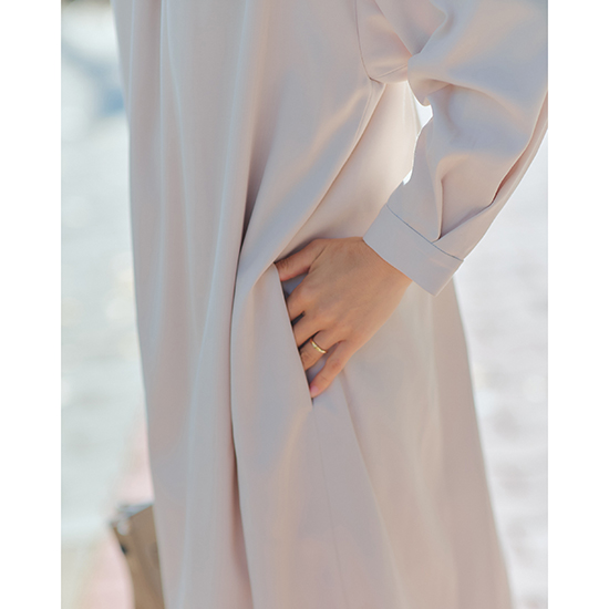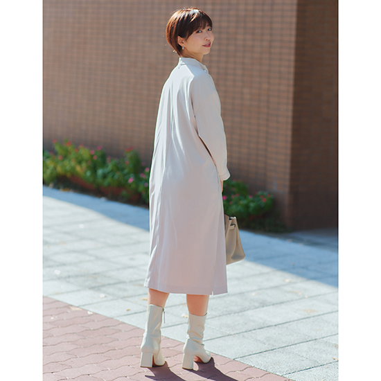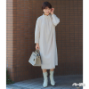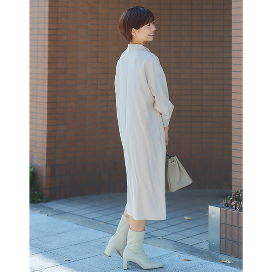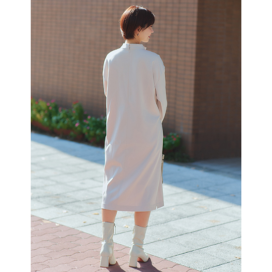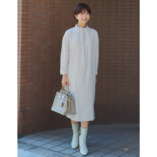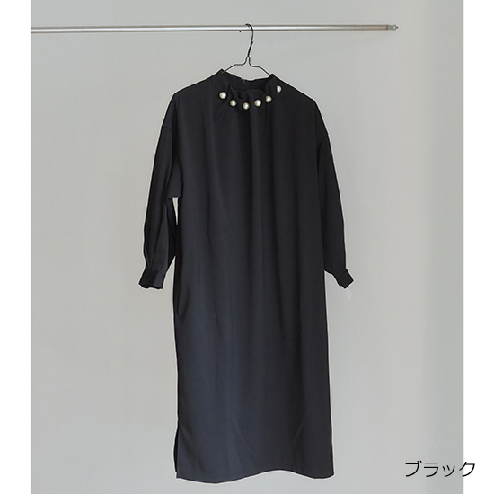 大きめのパールがアクセントのワンピース。上品見えするしっかりめの生地にパールや立体的なネックデザインをプラスし、