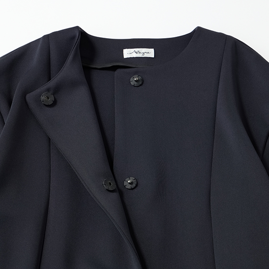 また、ノーカラーデザインなので、ボウタイブラウスやアクセサリーとも好相性です。