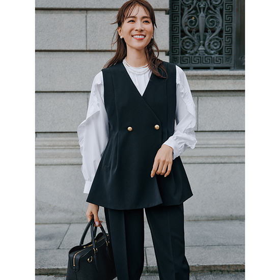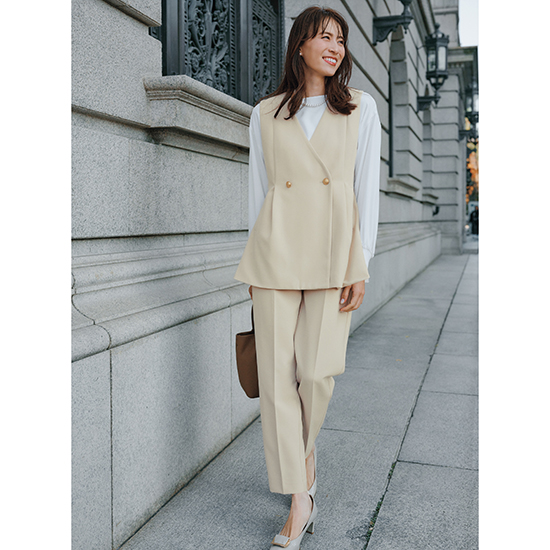 ジャケットやジレスタイルはもちろん、ニットやカットソーなどカジュアルなトップスとも好相性です。