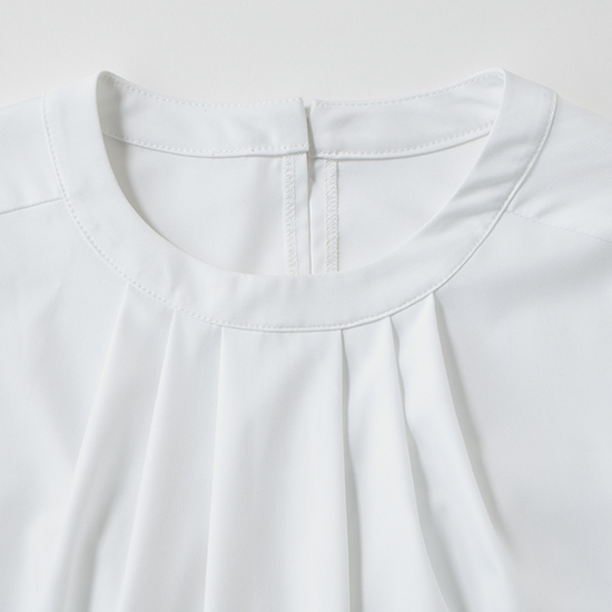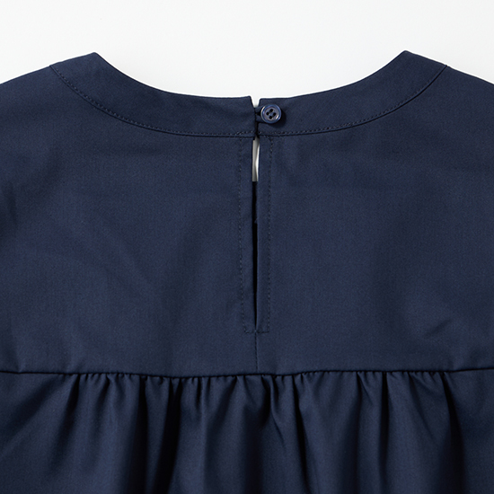 首元のタックがキレイなAラインシルエットを描き、さらに試作を重ねた絶妙な丈で、ウエストインせずに一枚で着てもサマになるバランスに。