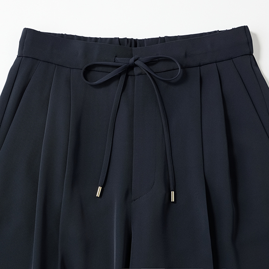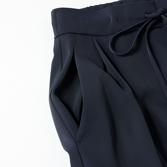 ウエストタックと素材のしなやかさが腰まわりをすっきりと見せ、後ろ姿まできれいに決まります。