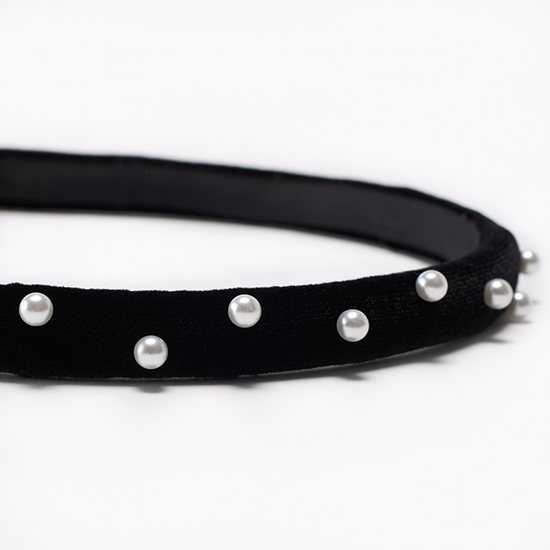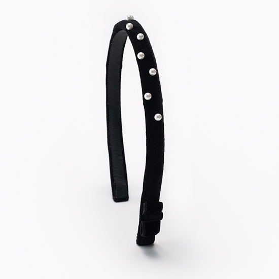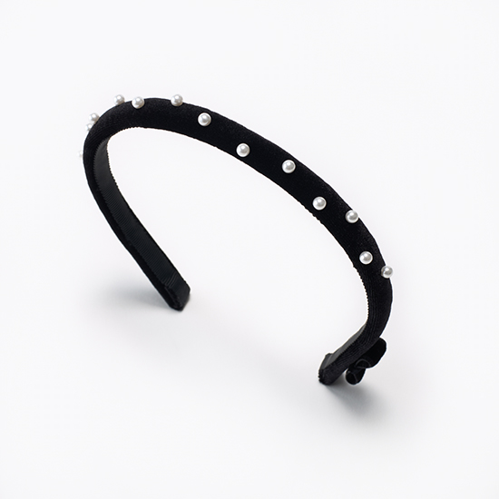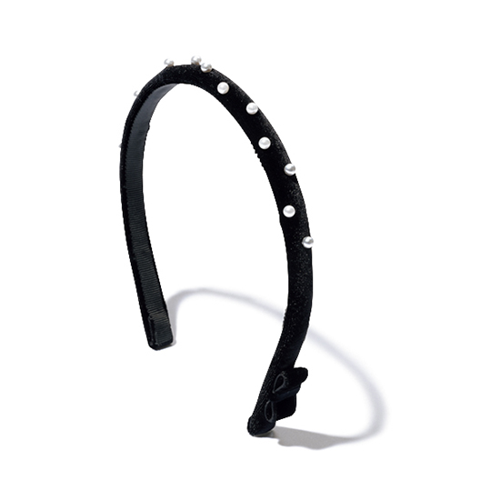 細身のベロアカチューシャにパールをちりばめた大人のための華奢カチューシャ。
