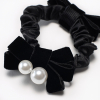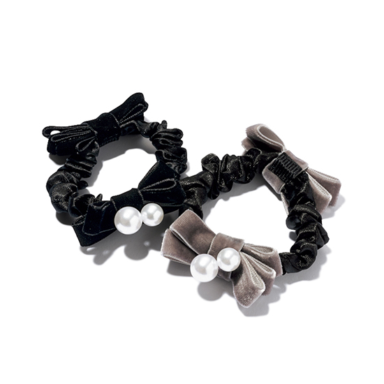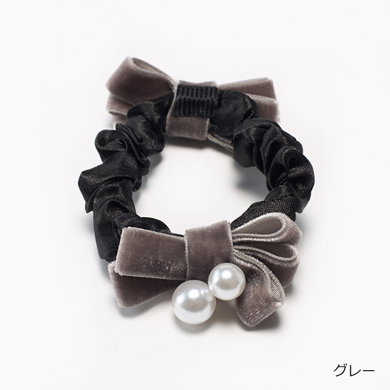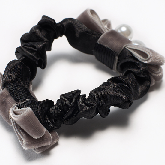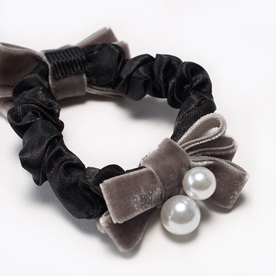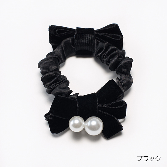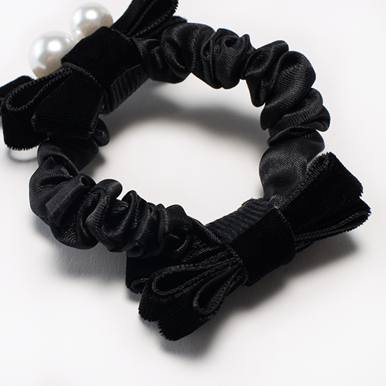 ベロアリボンに大小のパールがリズミカルにあしらわれたサテンシュシュ。