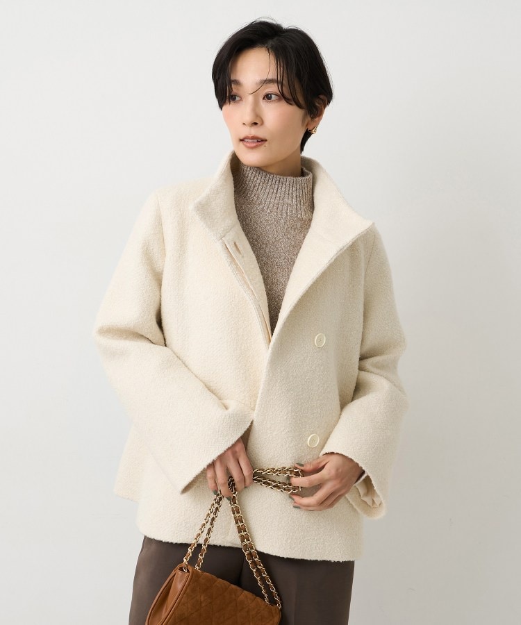 【デザイン】ファンシーヘリンボンのスタンドカラーコート。クラシックなデザインがエレガントさを引き立てながら、どんなシーンにもピッタリなアイテムです。スタンドカラーが首元をすっきりと見せ、シンプルなトップスやニットとも好相性です。後ろ中心のタックのディテールが可愛らしさを引き立てています。【素材感】クラシック感のあるツイード風コート素材。フラットな糸とスラブ糸やリング糸をミックスして経緯に使用し、ヘリンボーンの組織を作り上げる事で、カジュアル且つ良質な雰囲気に上げた素材になります。少しバルキーな表情感にヘリンボーン組織が映える今年らしい素材感に仕上げています。【仕様】・ポケット数:横×2・裏地あり※照明の関係により、実際よりも色味が違って見える場合があります。また、パソコン・スマートフォンなどの環境により、若干製品と画像のカラーが異なる場合もございます。